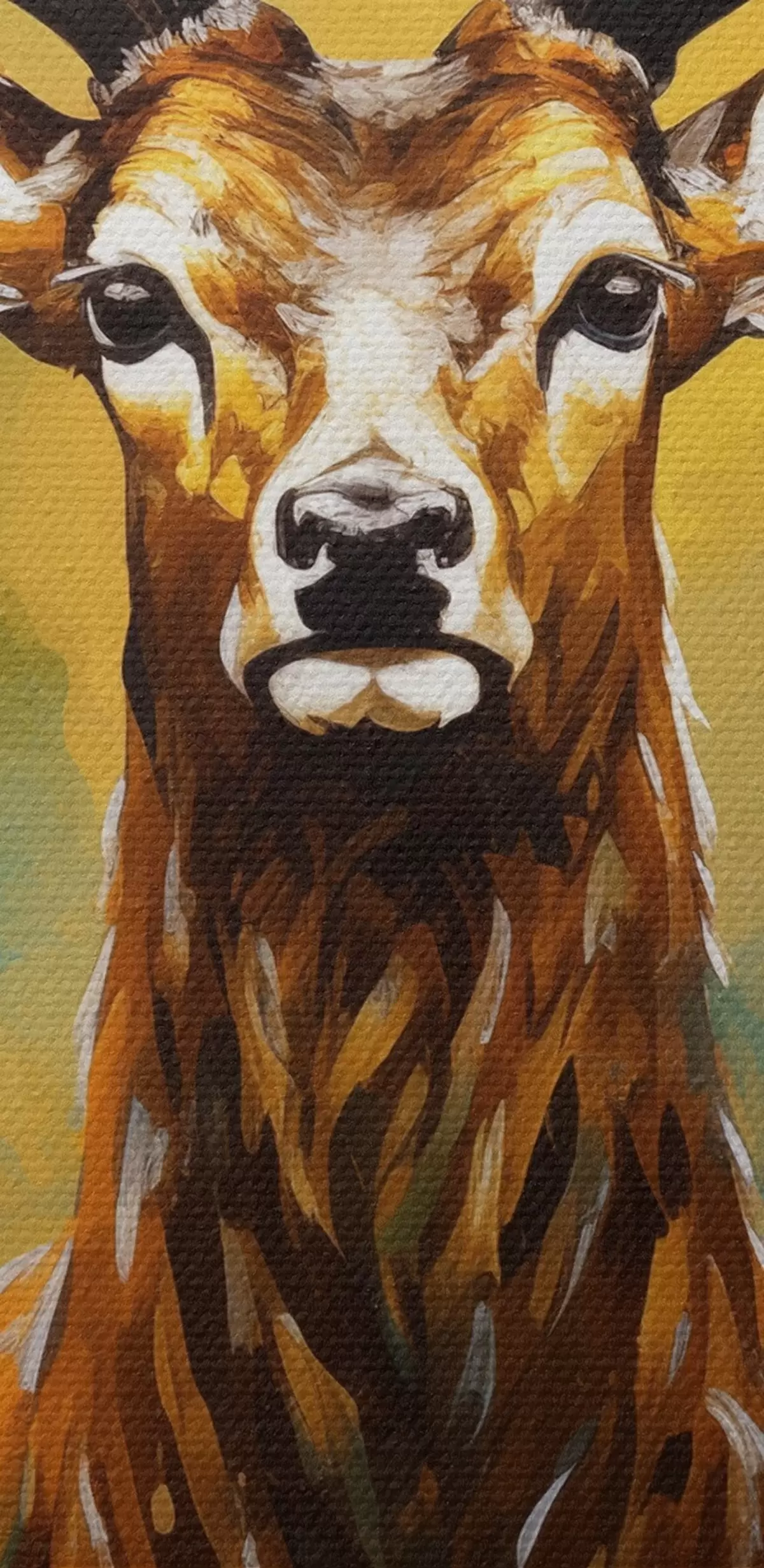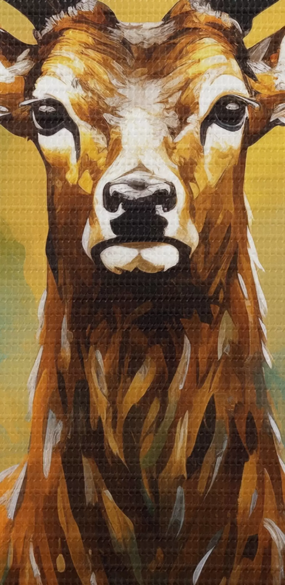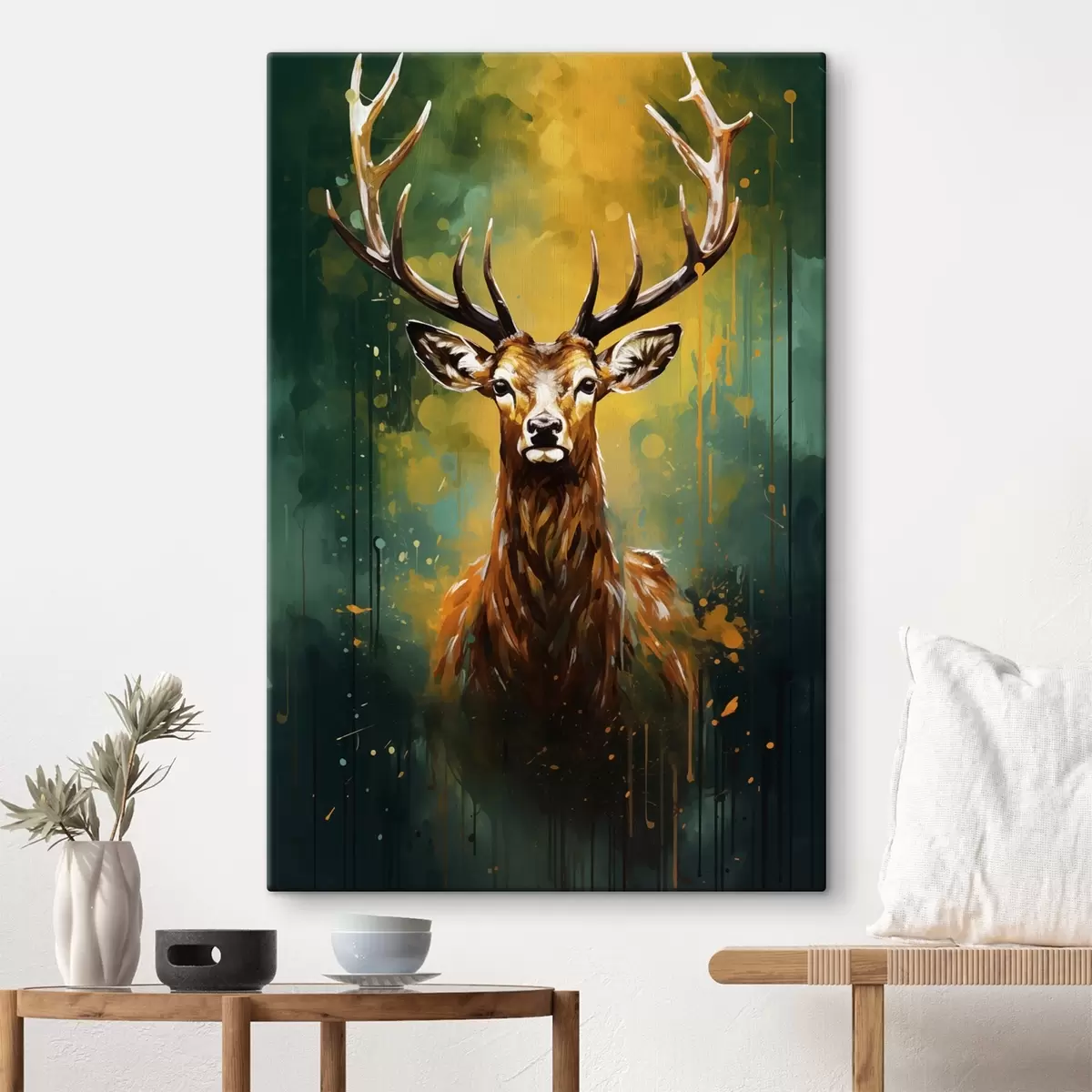 Obraz jeleń, poroże, zieleń lasu, pomarańczowy plusk, portret zwierzęcia, kropla farby, odważny, dzika przyroda Nr s45111