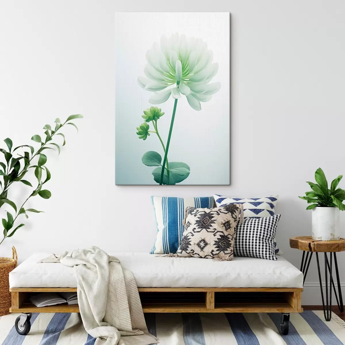 Obraz Biały kwiat koniczyny z zieloną łodygą i liśćmi, miękkie oświetlenie, czyste tło, minimalistyczna kompozycja, botaniczne s45171