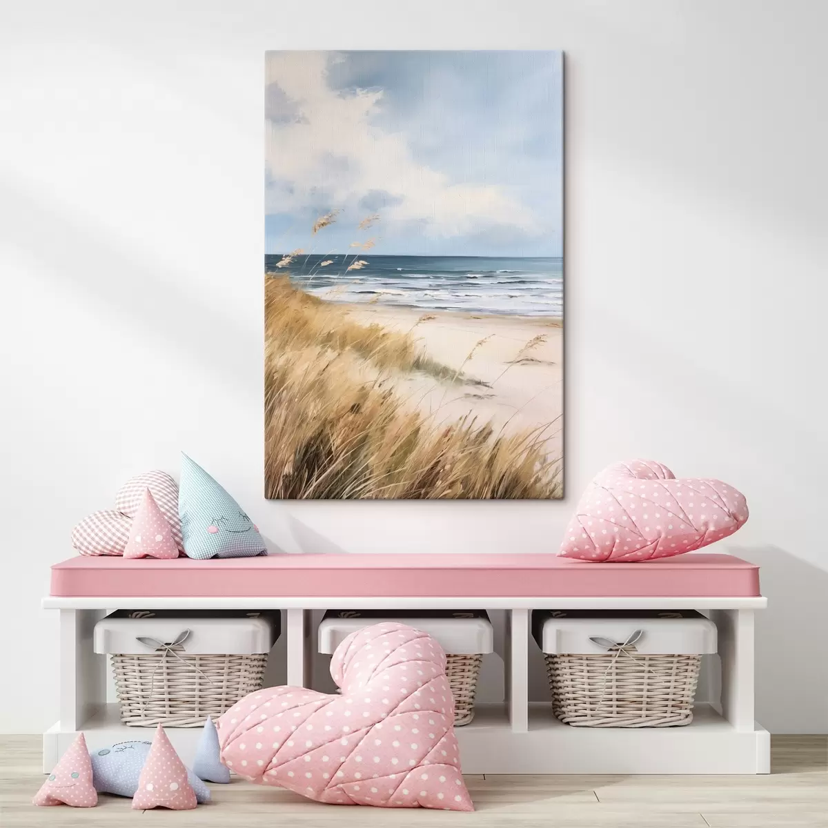 Obraz Piaszczysta plaża z wysoką trawą na pierwszym planie, ocean z falami i zachmurzone niebo w tle Nr s45174