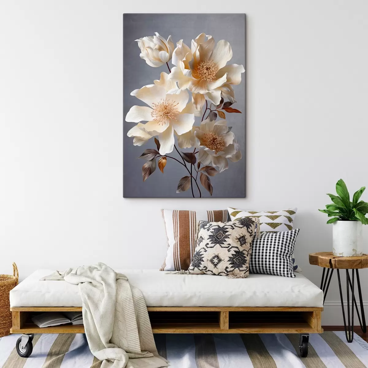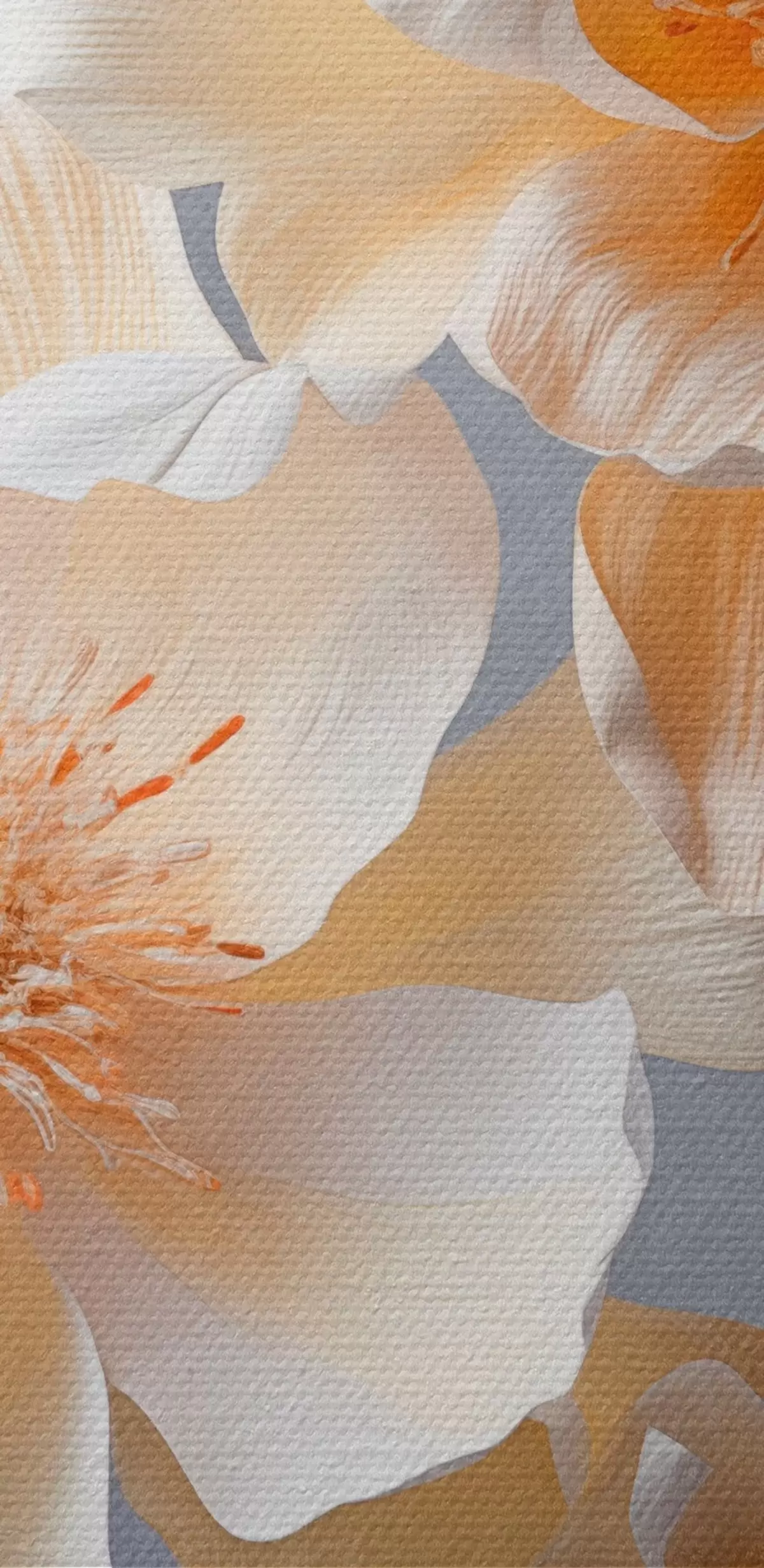 Obraz Teksturowane kwiaty z pomarańczowymi słupkami i pomarańczowymi liśćmi na szarym tle, miękkie światło, eleganckie, szczegółowe, realistyczne Nr s45181