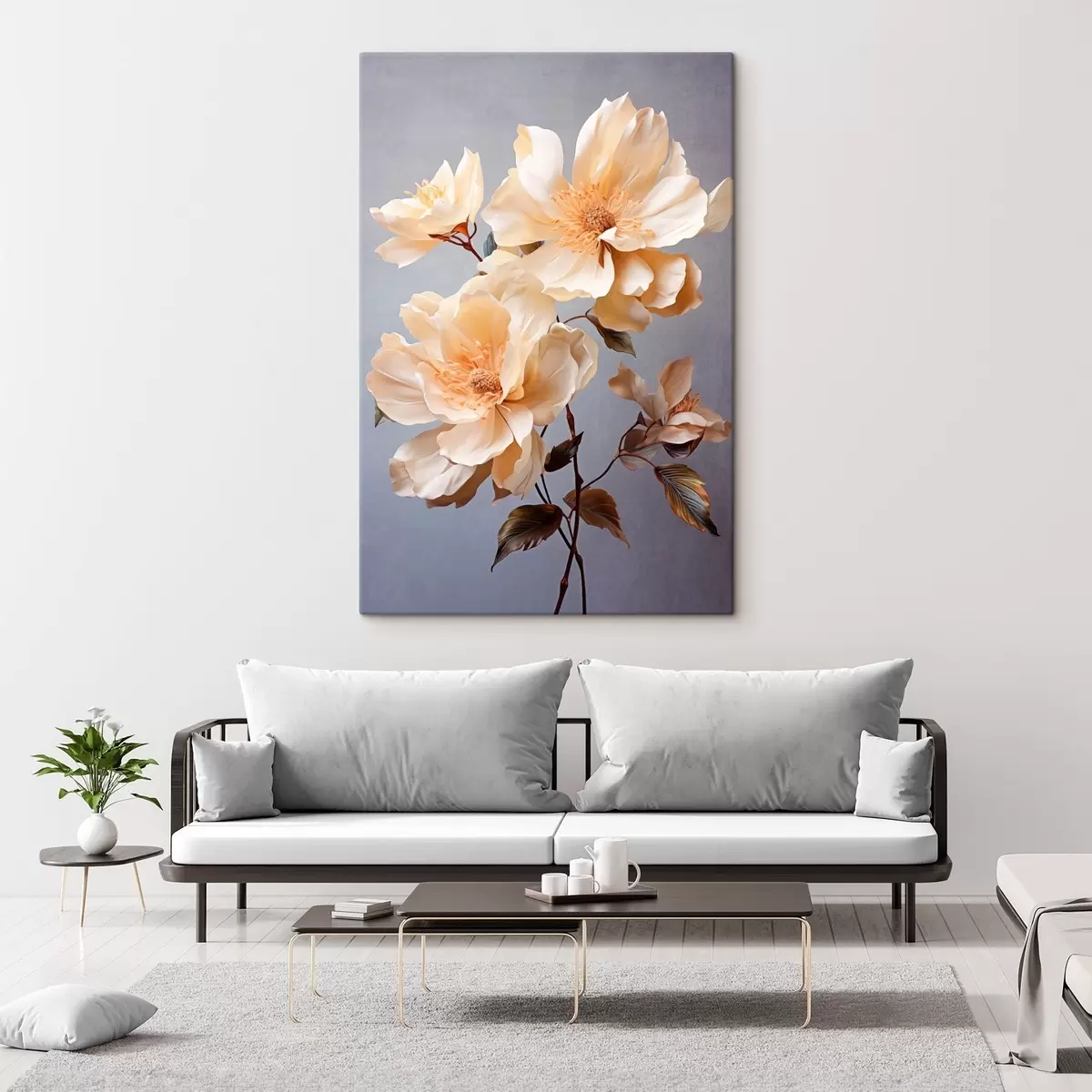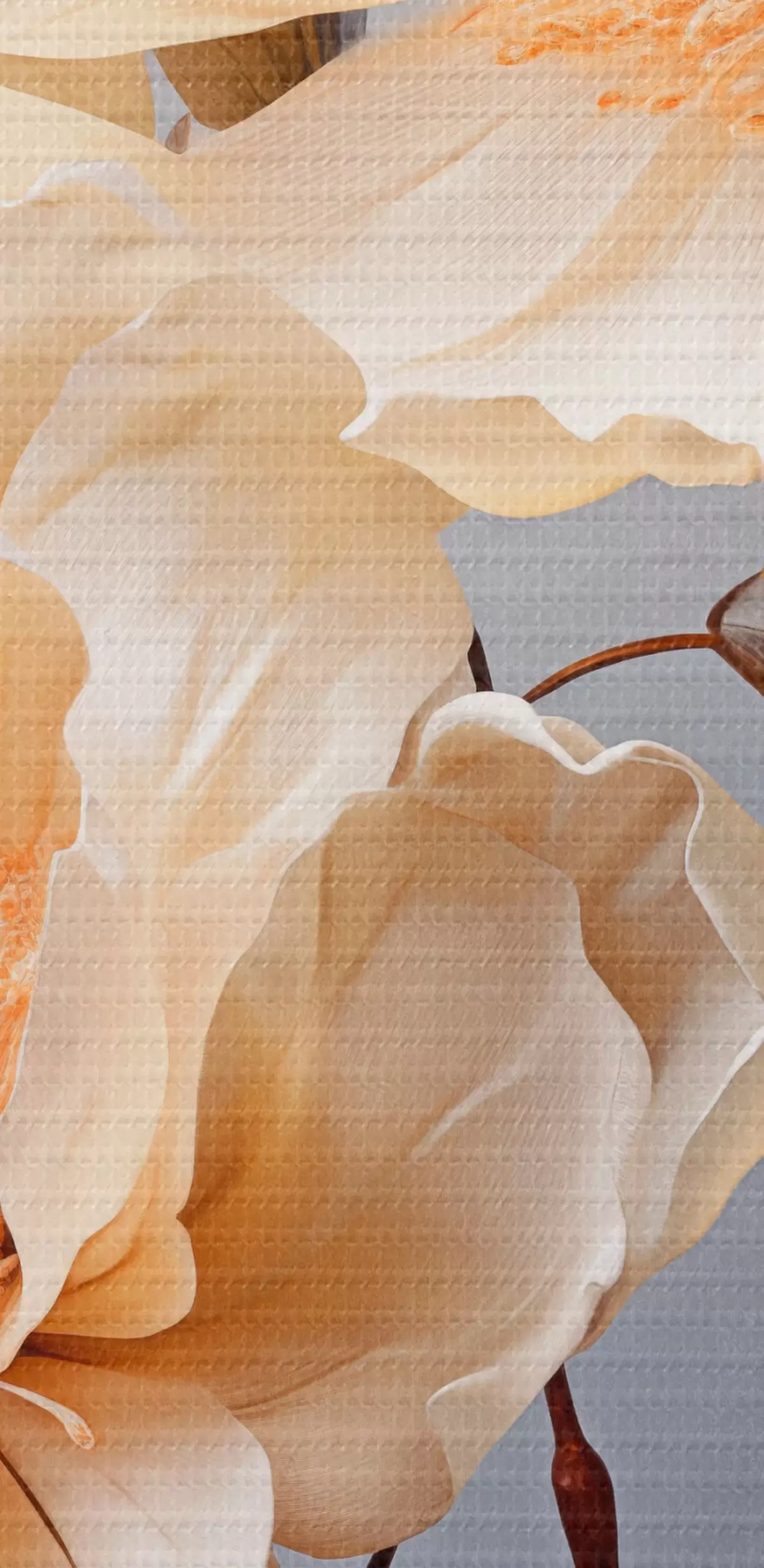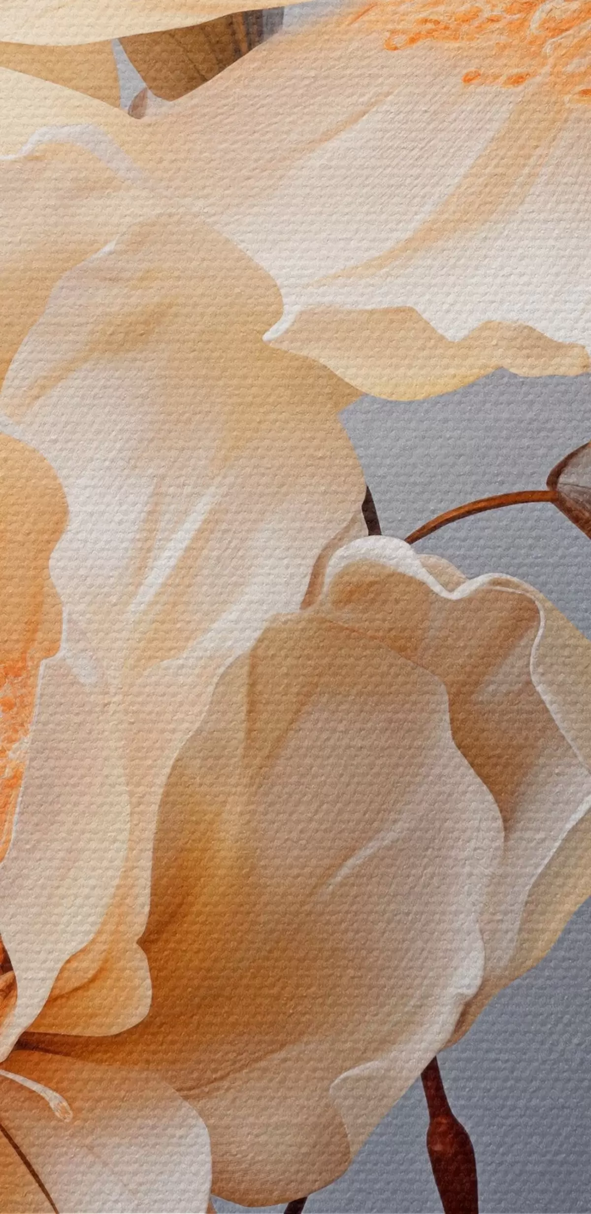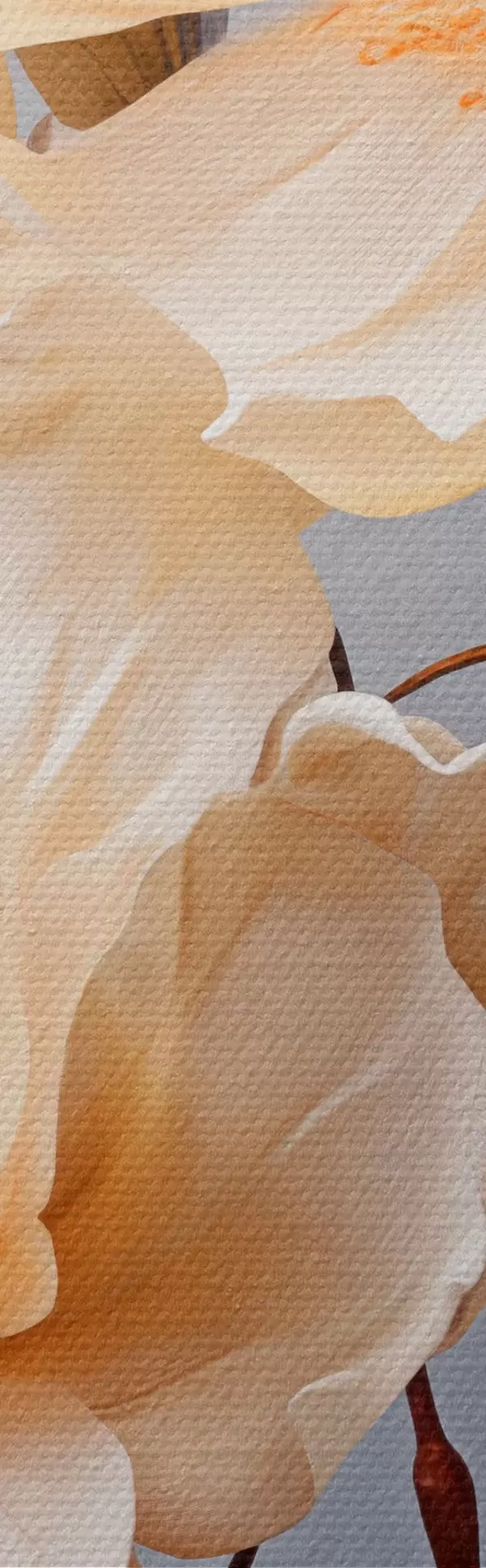 Obraz Teksturowane kwiaty z pomarańczowymi słupkami i pomarańczowymi liśćmi na szarym tle, miękkie światło, eleganckie, szczegółowe, realistyczne Nr s45182