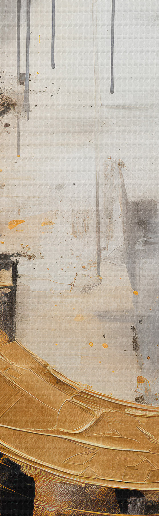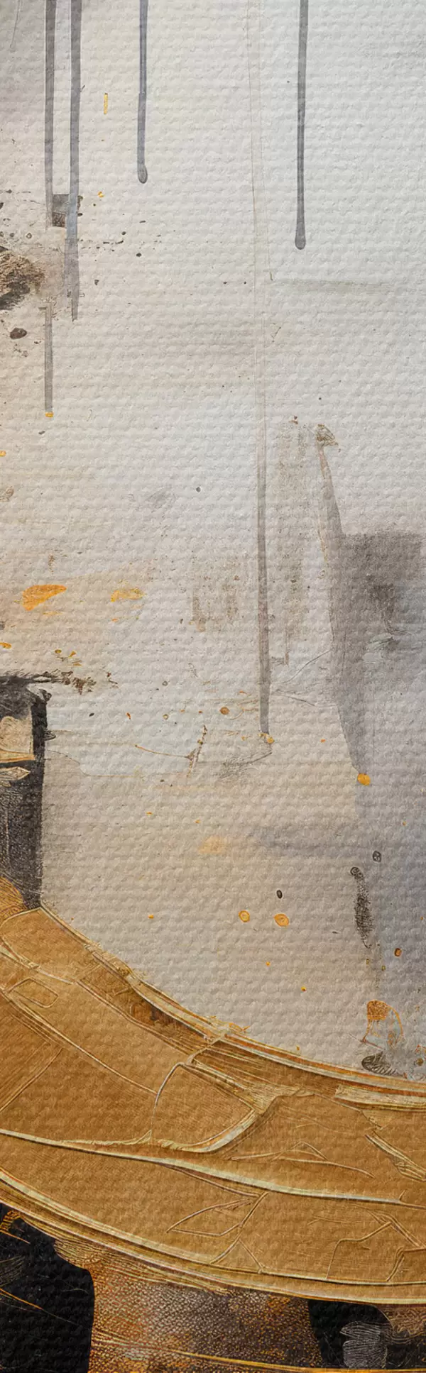 Obraz Abstrakcyjny obraz z okręgami, czarnymi i żółtymi liniami oraz tłem w odcieniach szarości i bieli Nr s45186