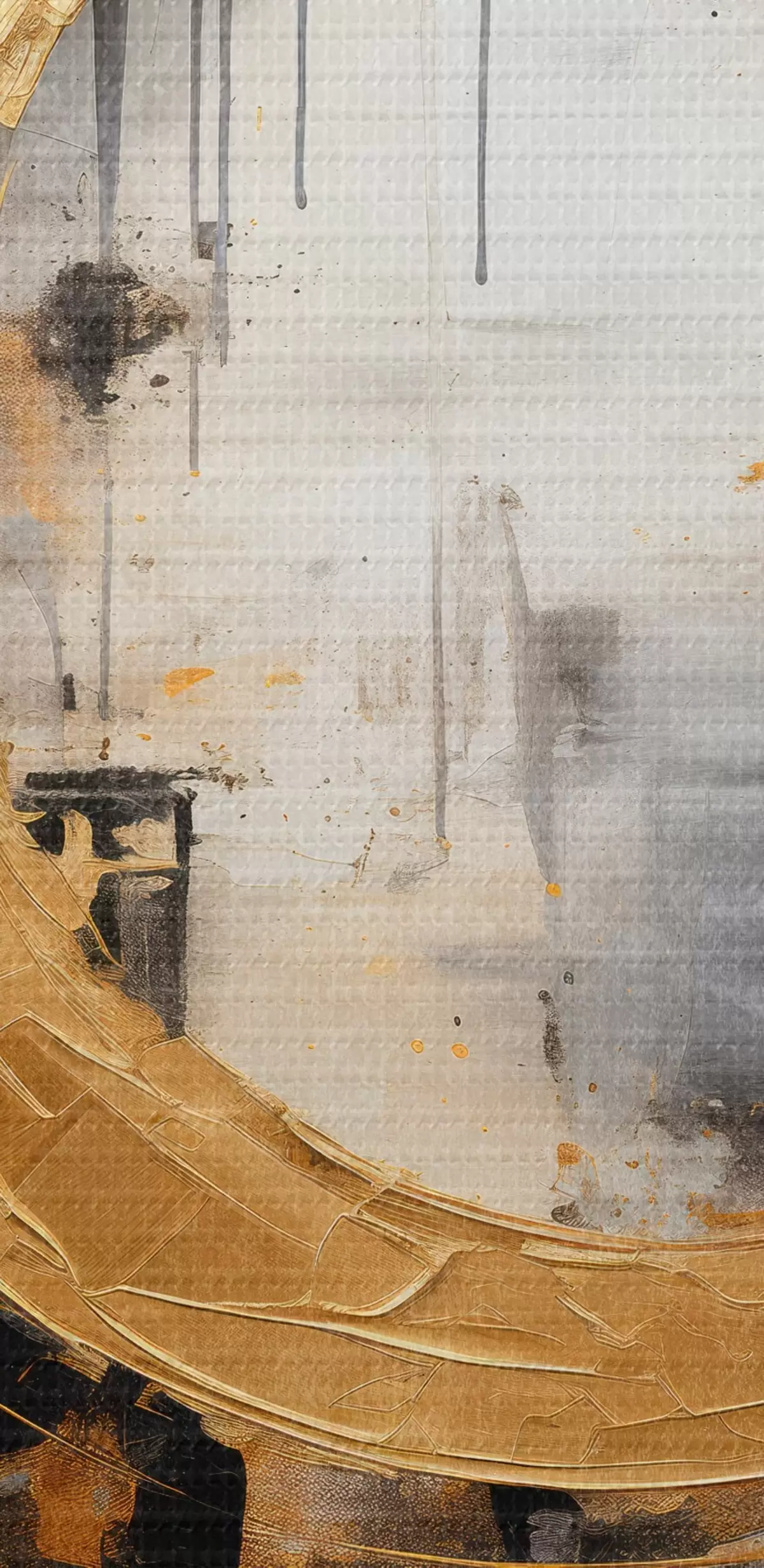 Obraz Abstrakcyjny obraz z okręgami, czarnymi i żółtymi liniami oraz tłem w odcieniach szarości i bieli Nr s45186