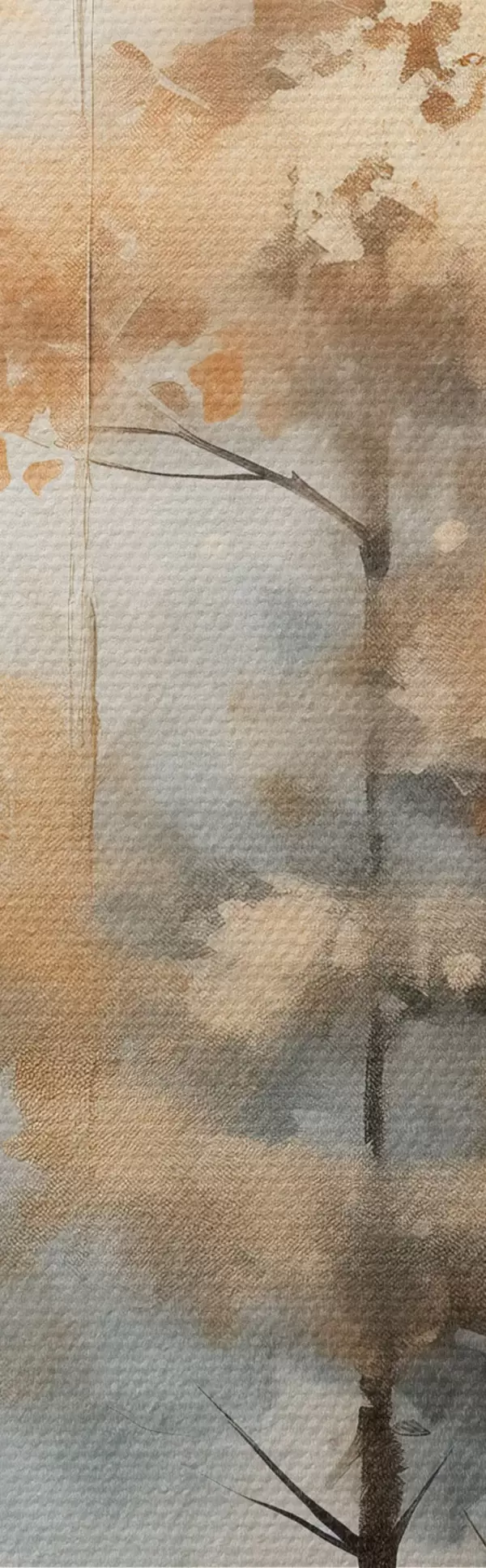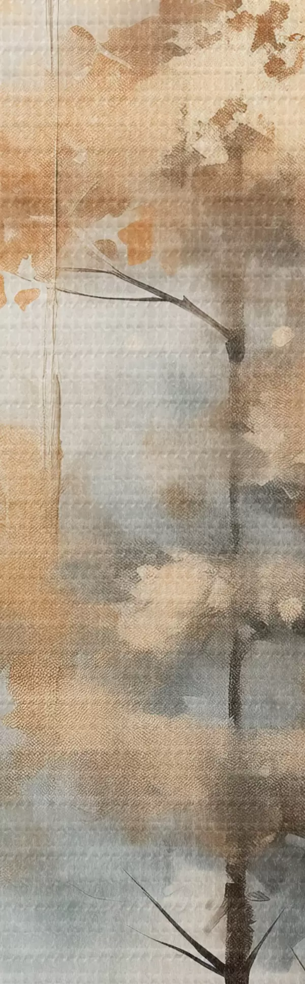 Obraz Teksturowane wysokie drzewa z żółtymi liśćmi w lesie, tło jest mieszanką delikatnych niebieskich i brązowych odcieni Nr s45187
