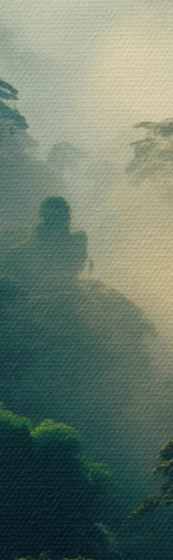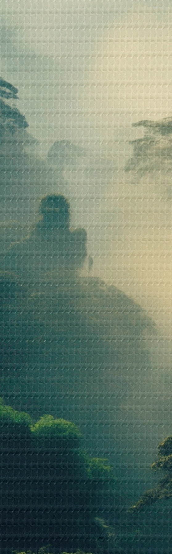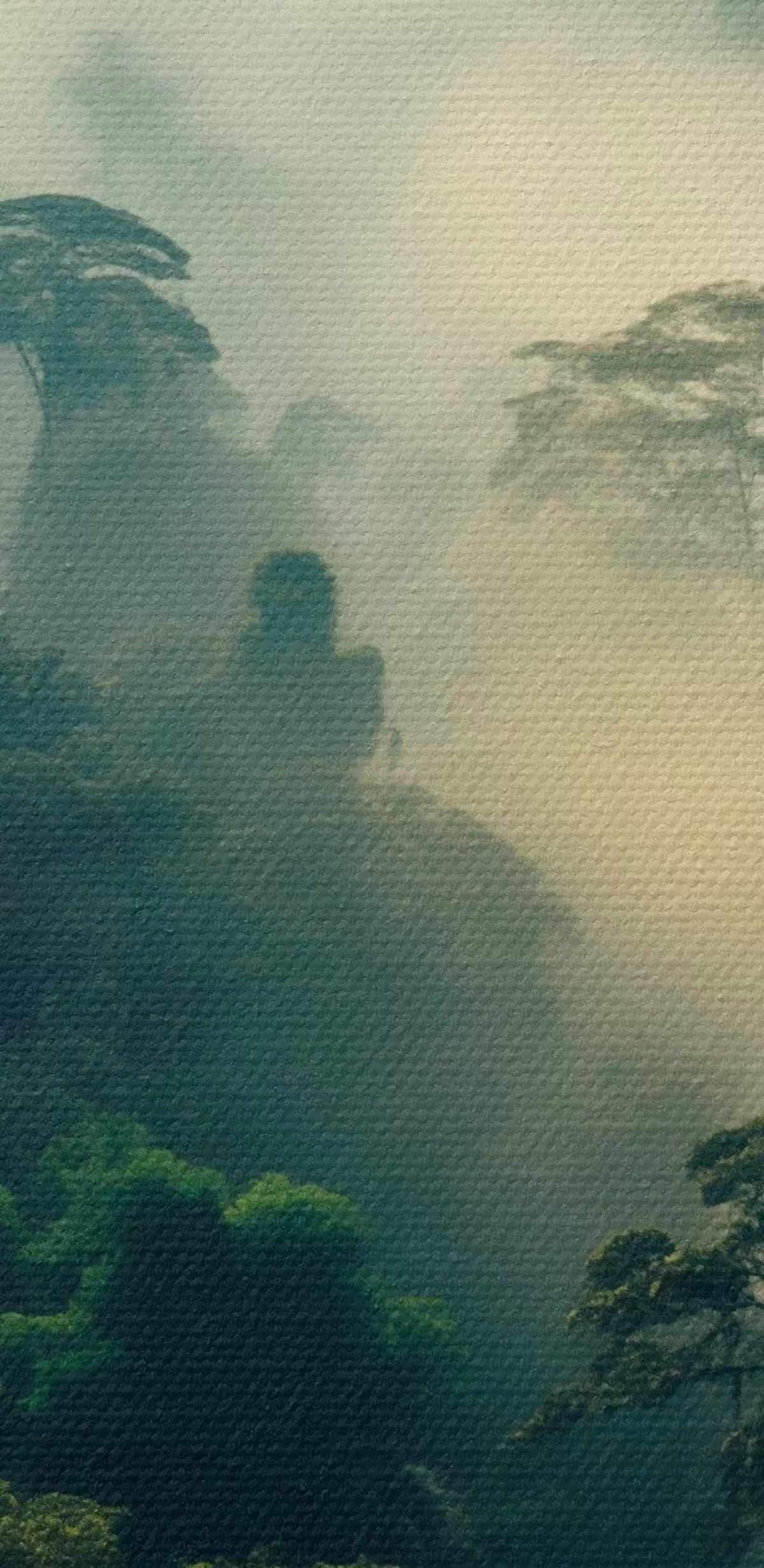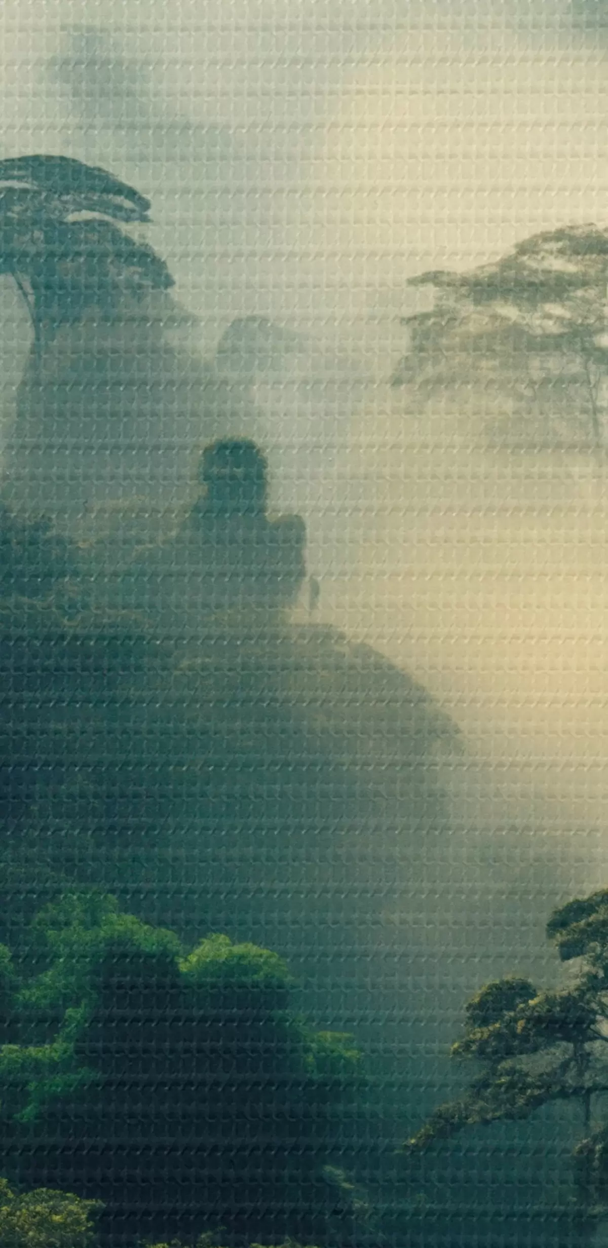 Obraz Tropikalny las deszczowy z bujnymi zielonymi drzewami i grubą warstwą mgły, tworzący nastrojowe otoczenie Nr s45190