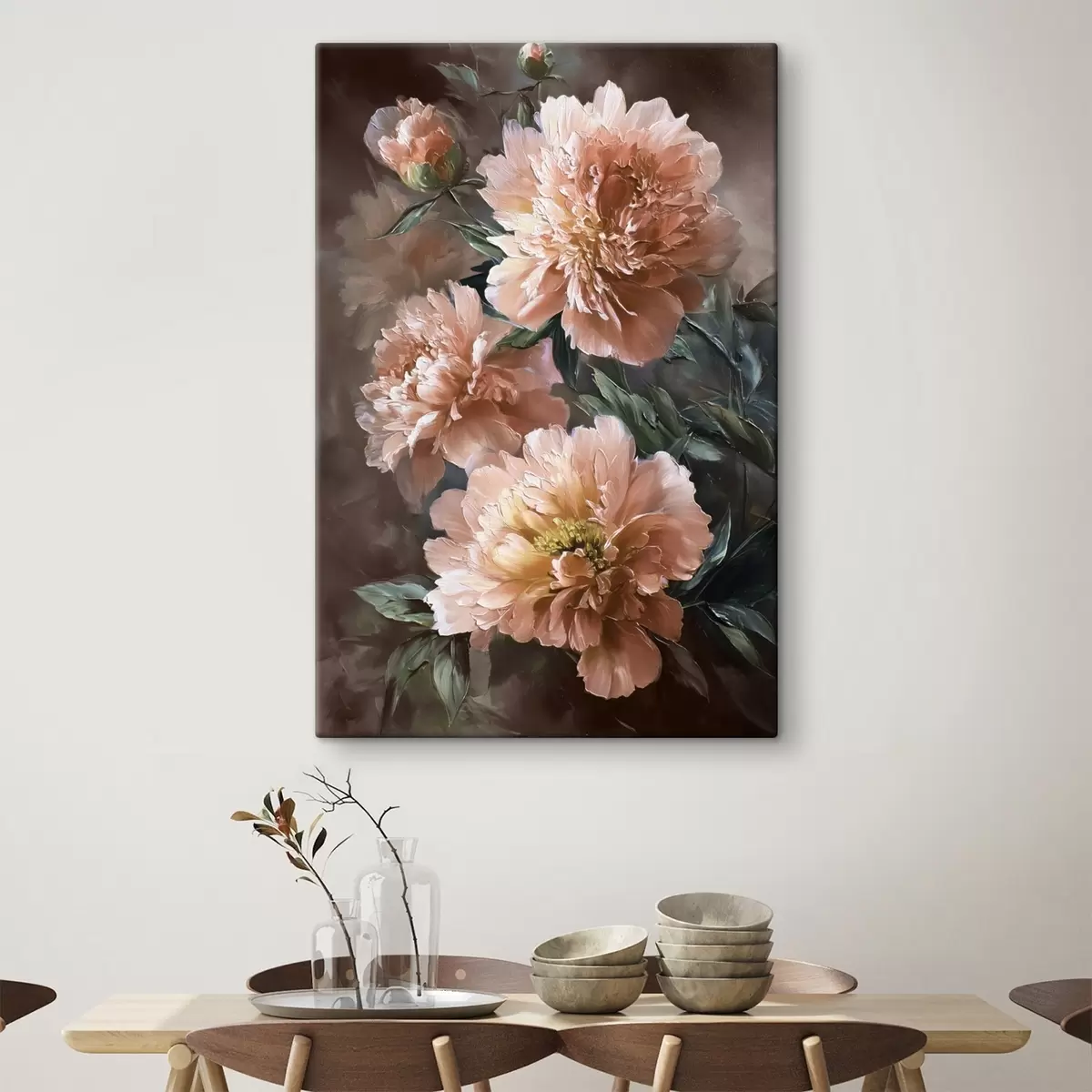 Obraz Bujne różowe piwonie na ciepłym tle w stylu pociągnięcia pędzlem Nr s45260