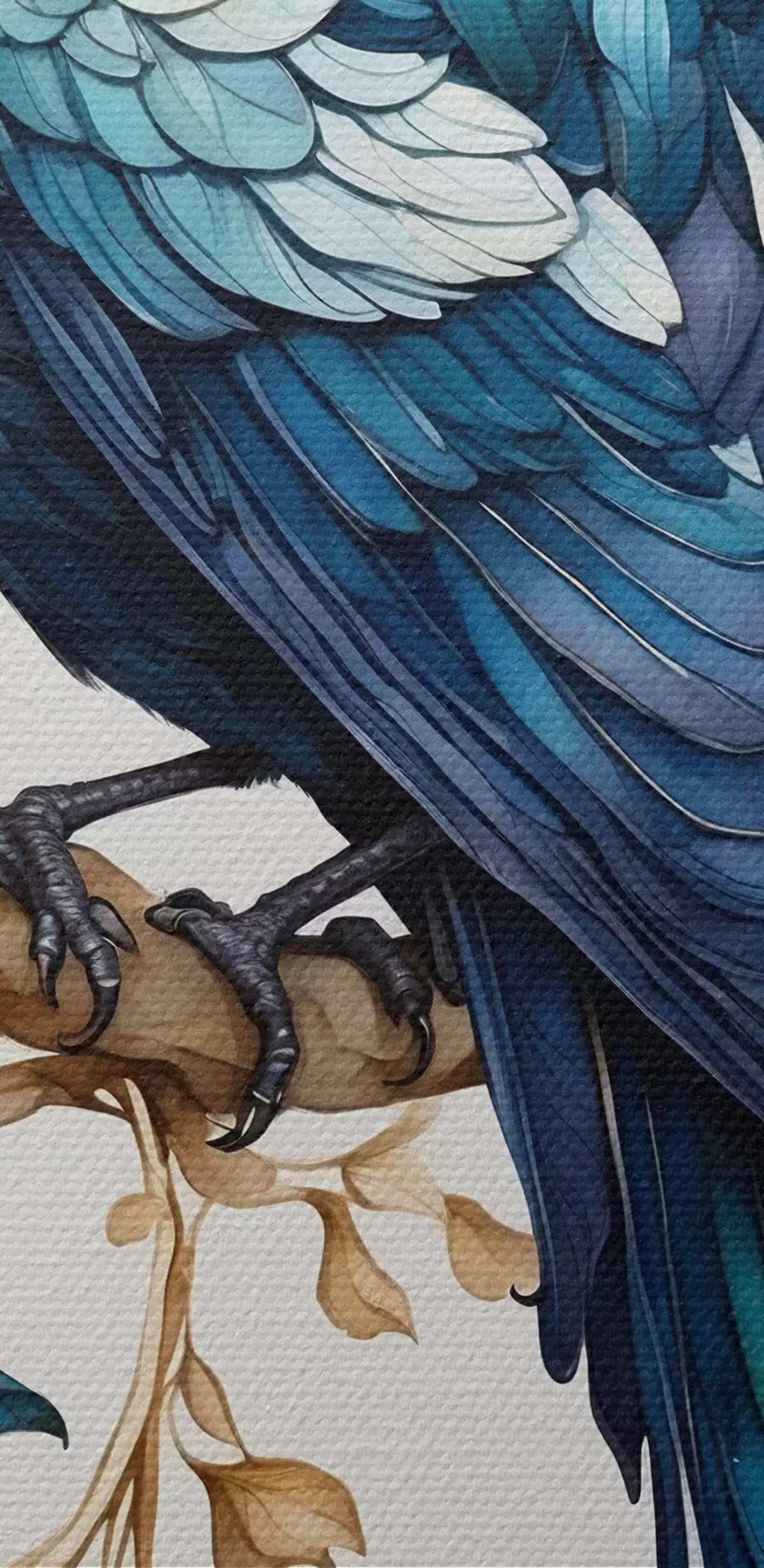 Obraz Niebieski ptak na gałęzi z akwarelowymi liśćmi Nr s45483
