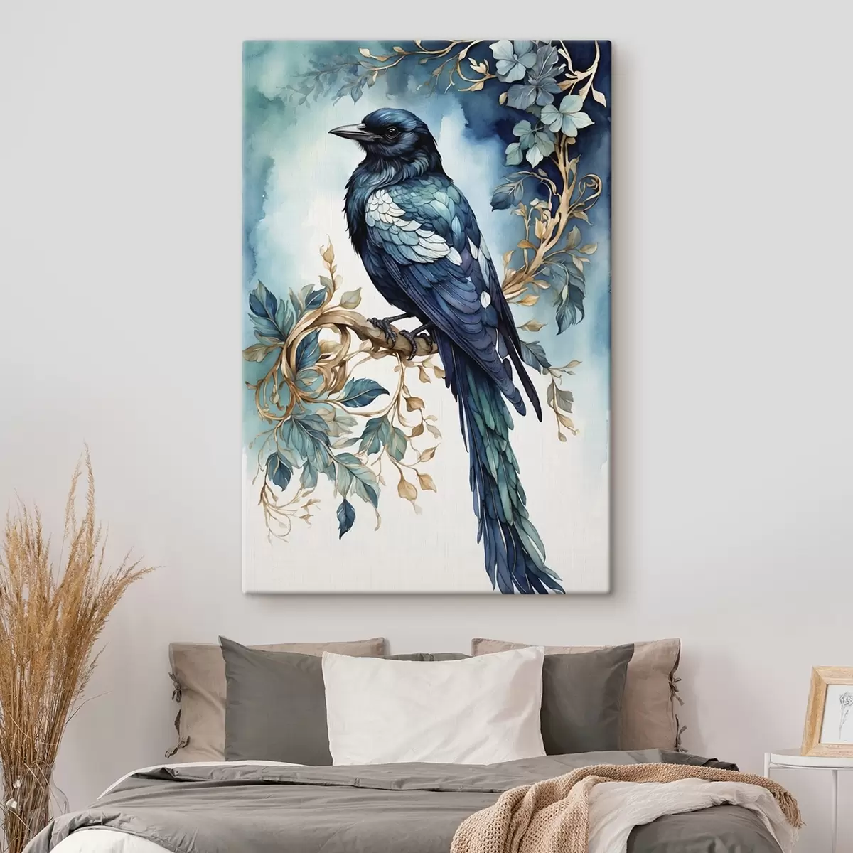 Obraz Niebieski ptak na gałęzi z akwarelowymi liśćmi Nr s45483