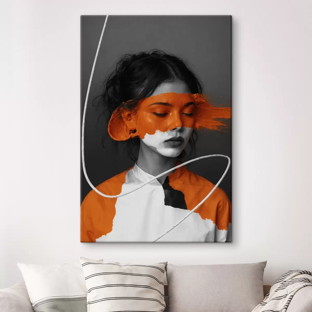 Obraz Portret dziewczyny z abstrakcyjnym pomarańczowym obrazem Nr s45495