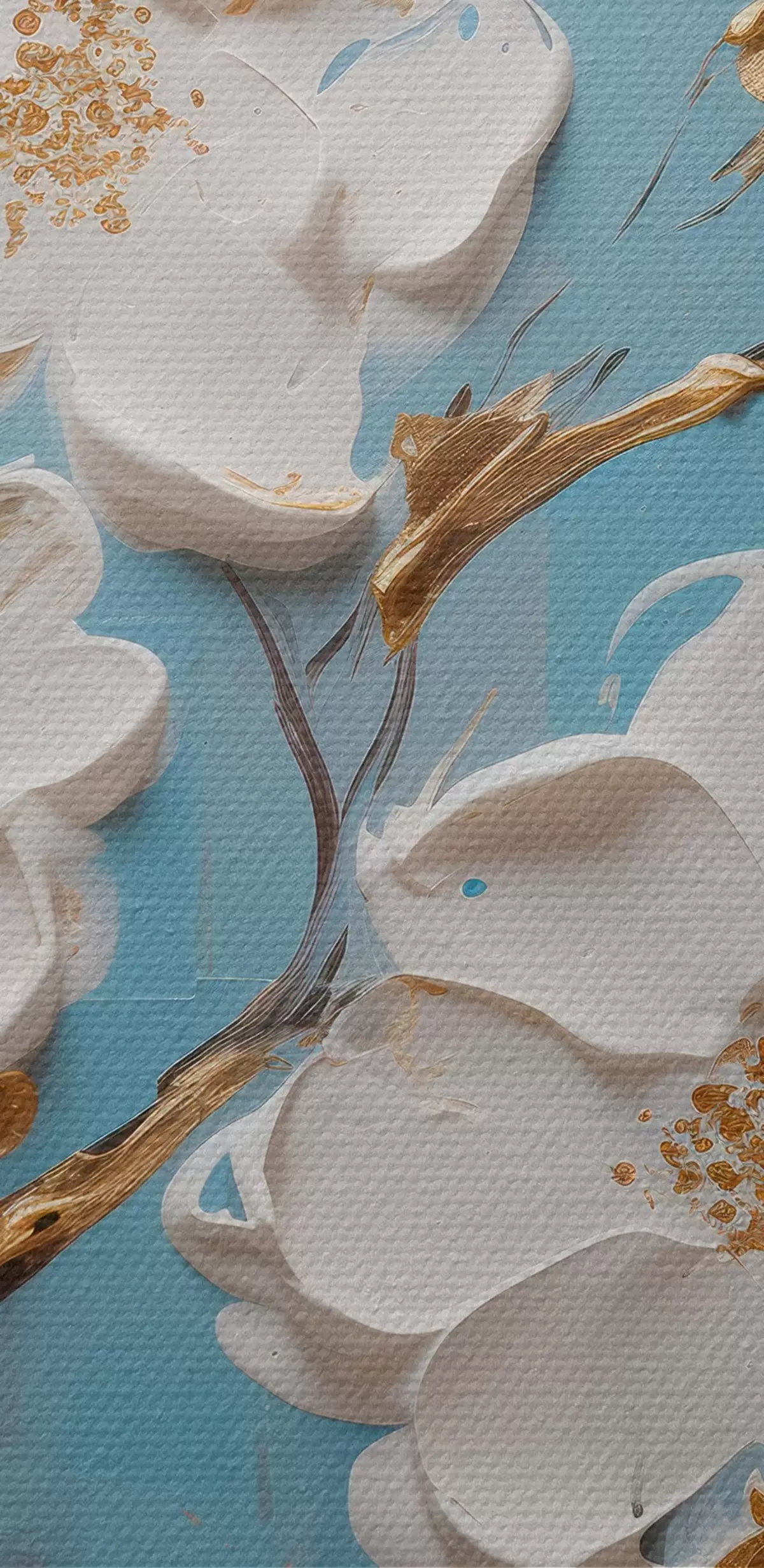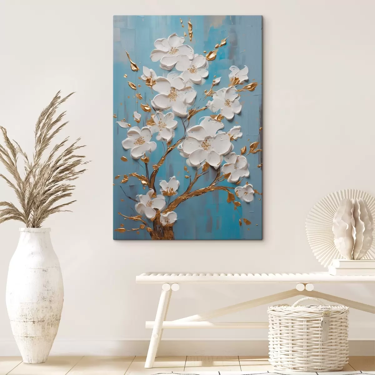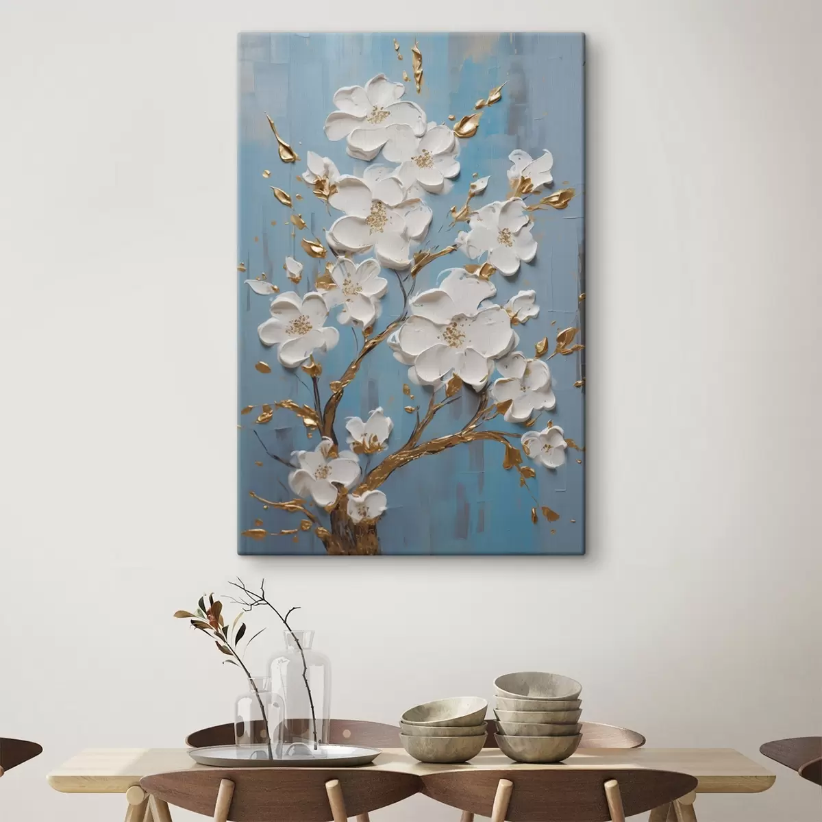 Obraz Białe kwiaty na gałęzi: motyw dekoracyjny w jasnoniebieskich odcieniach Nr s45541