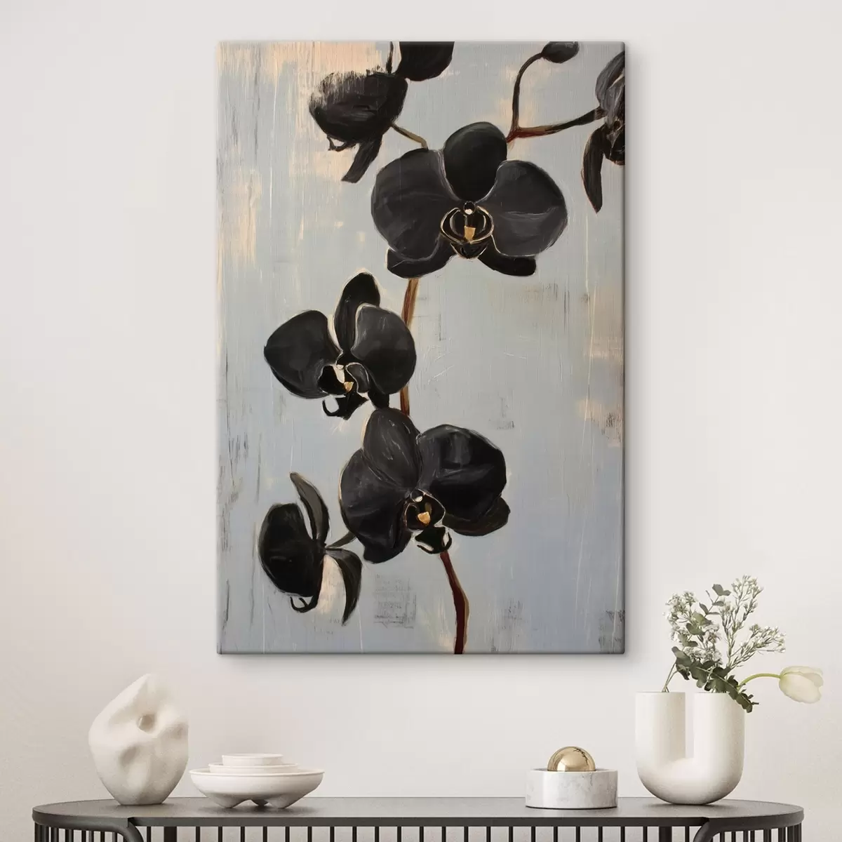 Obraz Storczyki dekoracyjne: czarne kwiaty na szarym tle s45547
