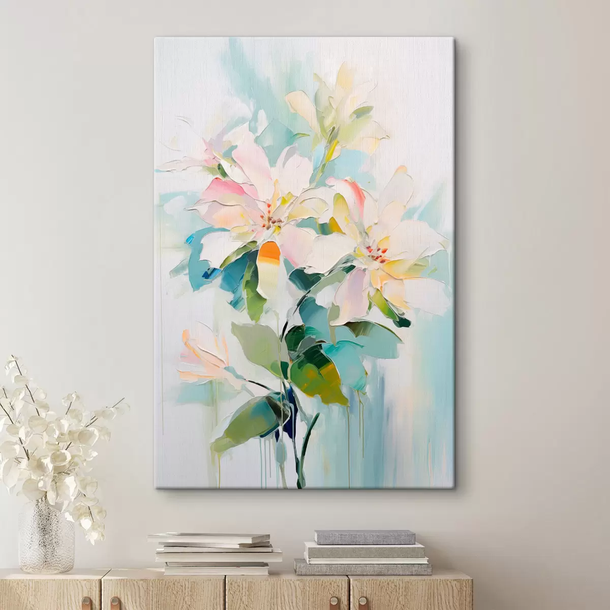 Obraz Kwiaty z kolorowymi akcentami, zielone liście, miękkie pociągnięcia pędzla imitacja obrazu olejnego, jasnoniebieskie tło Nr s45549