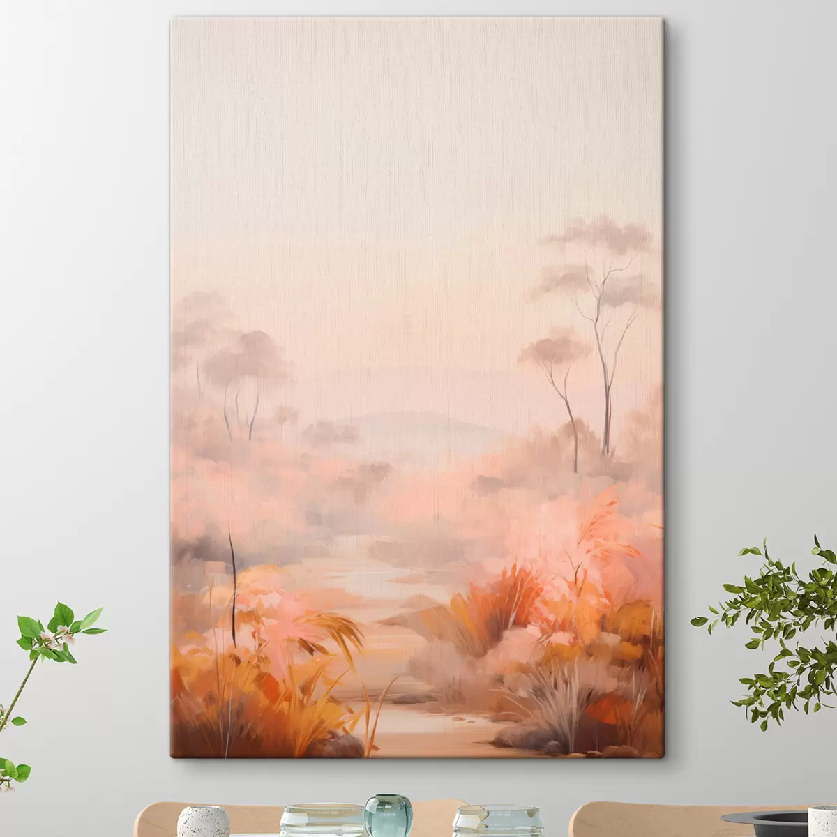 Obraz Krajobraz z krzewami i drzewami w odcieniach różu, pomarańczy i brązu, z górami w tle Nr s45553