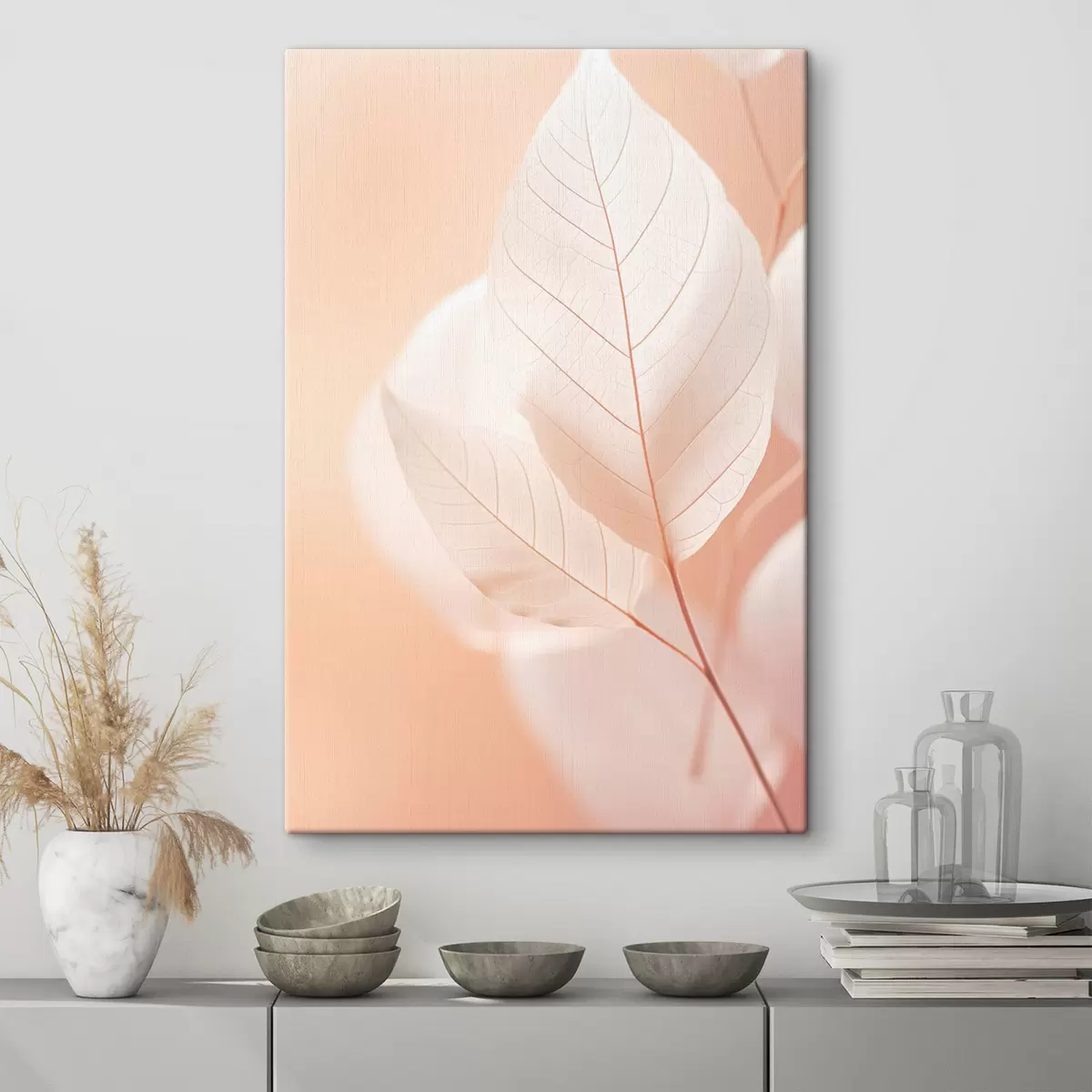 Obraz Delikatne, półprzezroczyste liście ze skomplikowanymi wzorami żył, miękkie brzoskwiniowe tło, minimalistyczna kompozycja botaniczna s45555