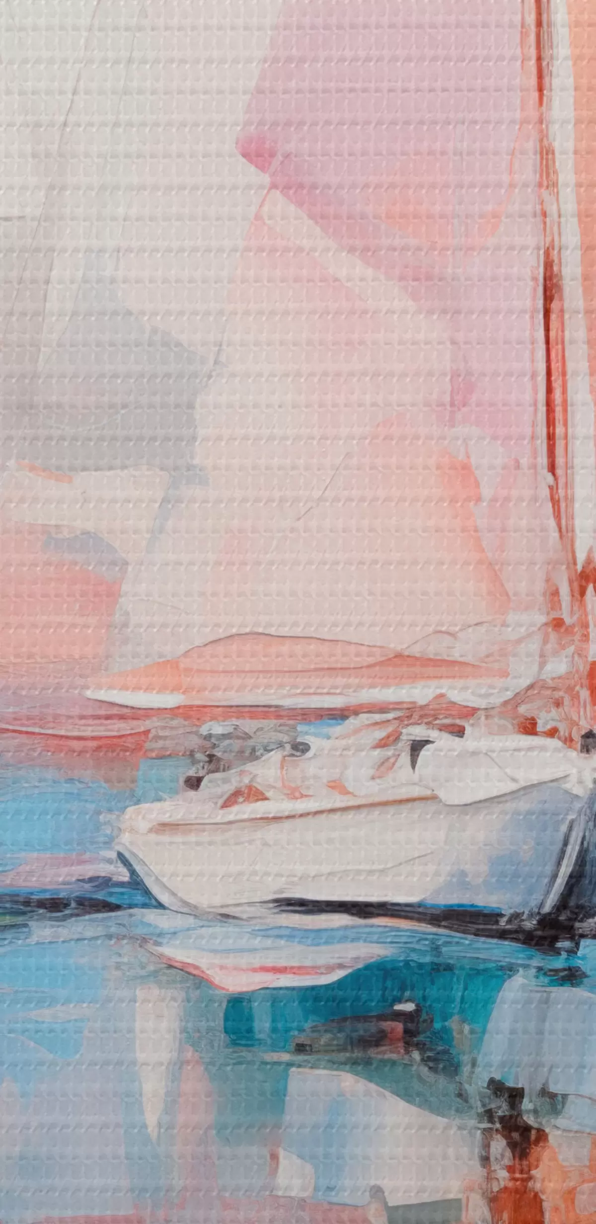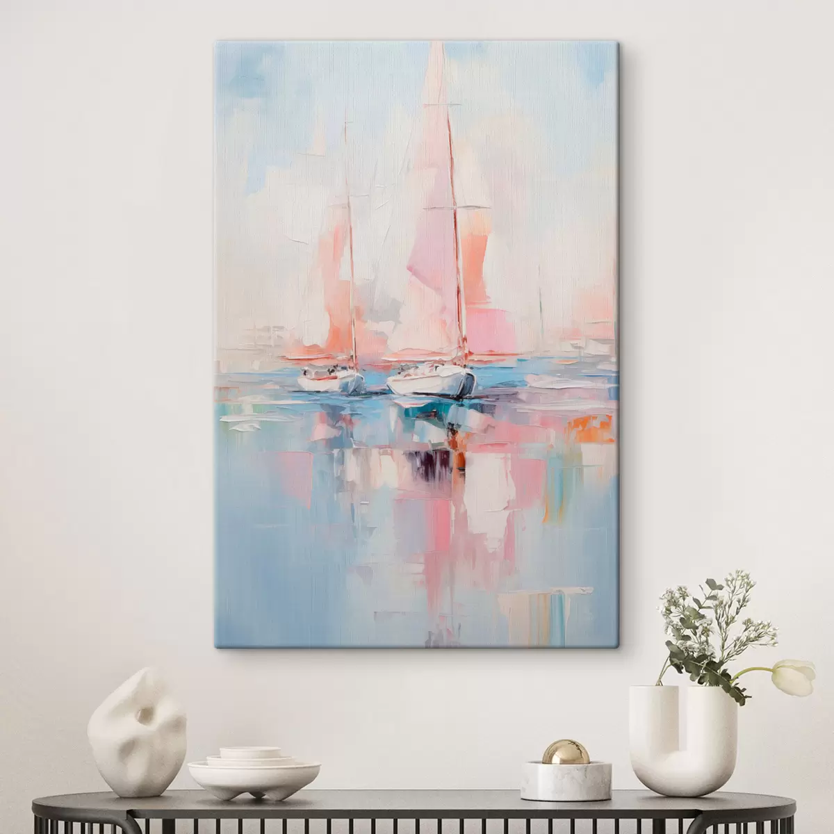 Obraz Żaglówki z różowymi żaglami unoszące się na spokojnym morzu, odbicia łodzi w wodzie, delikatne pastelowe kolory Nr s45557