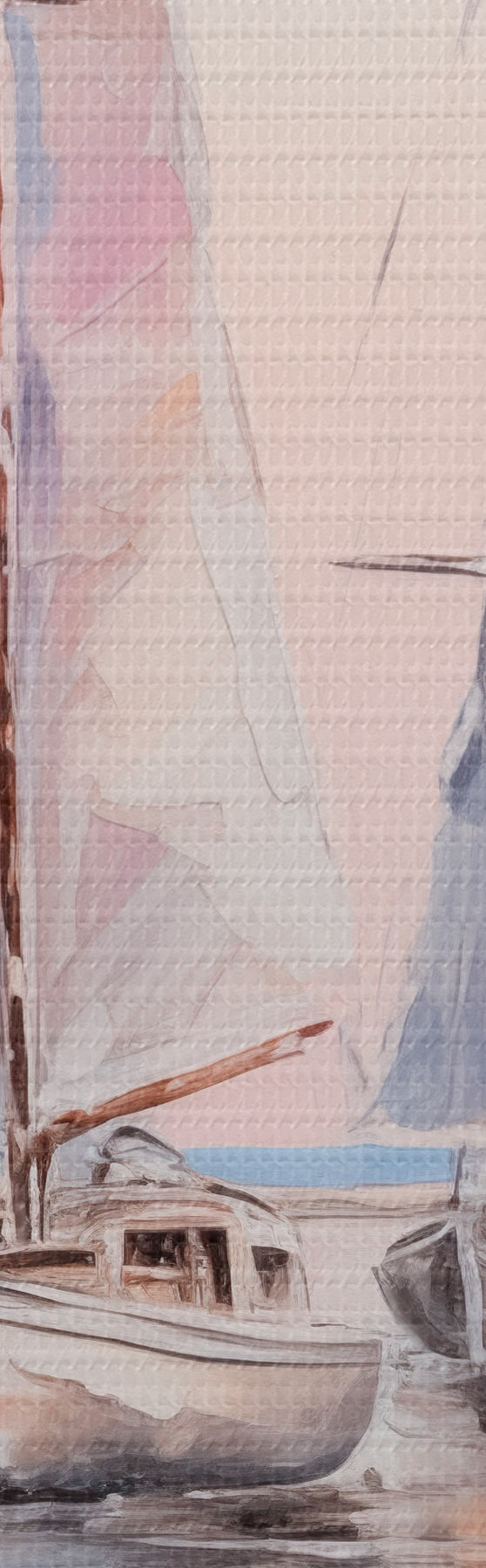 Obraz Żaglówki z różowymi żaglami unoszące się na spokojnym morzu, odbicia łodzi w wodzie, delikatne pastelowe kolory s45558