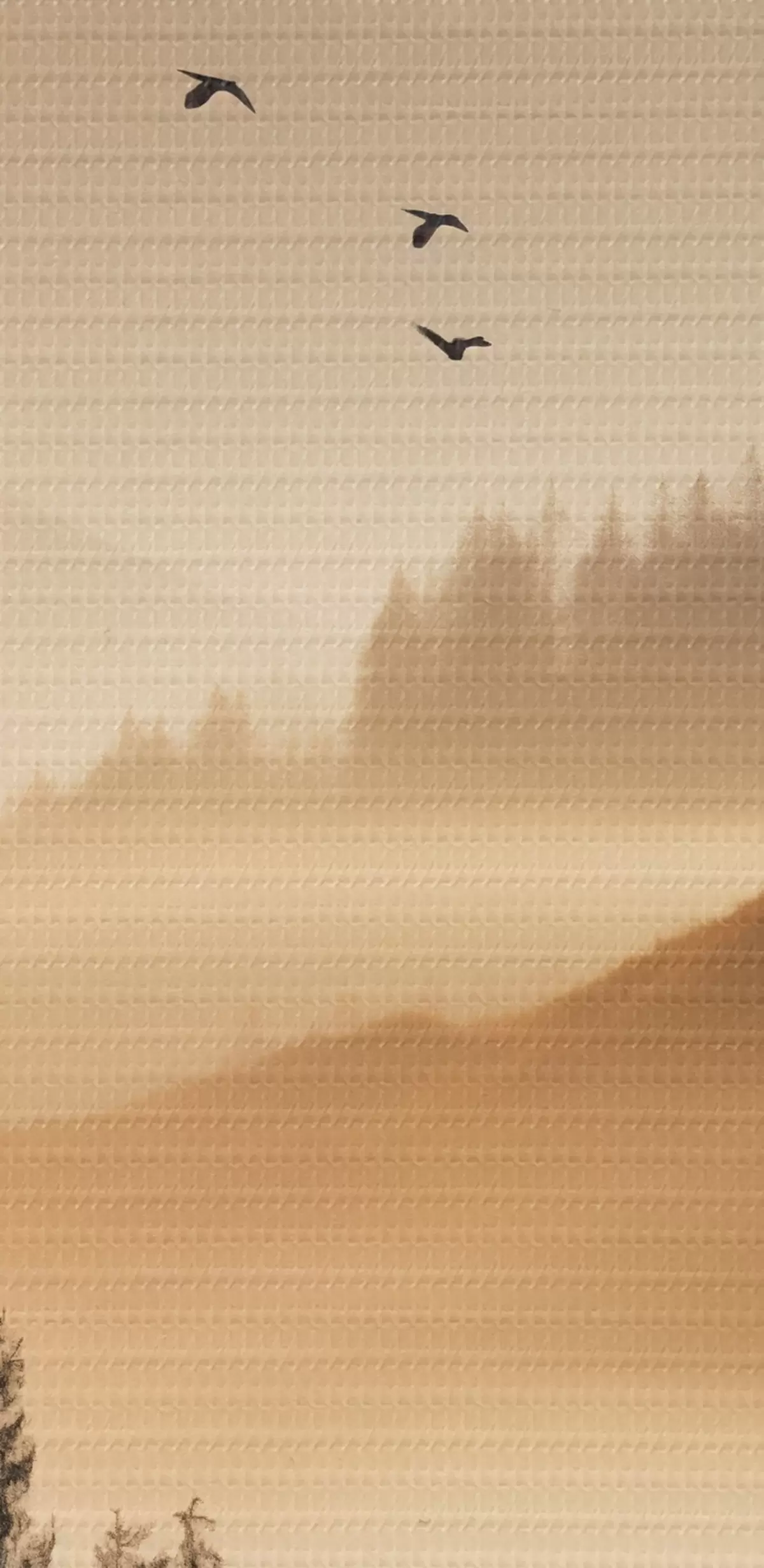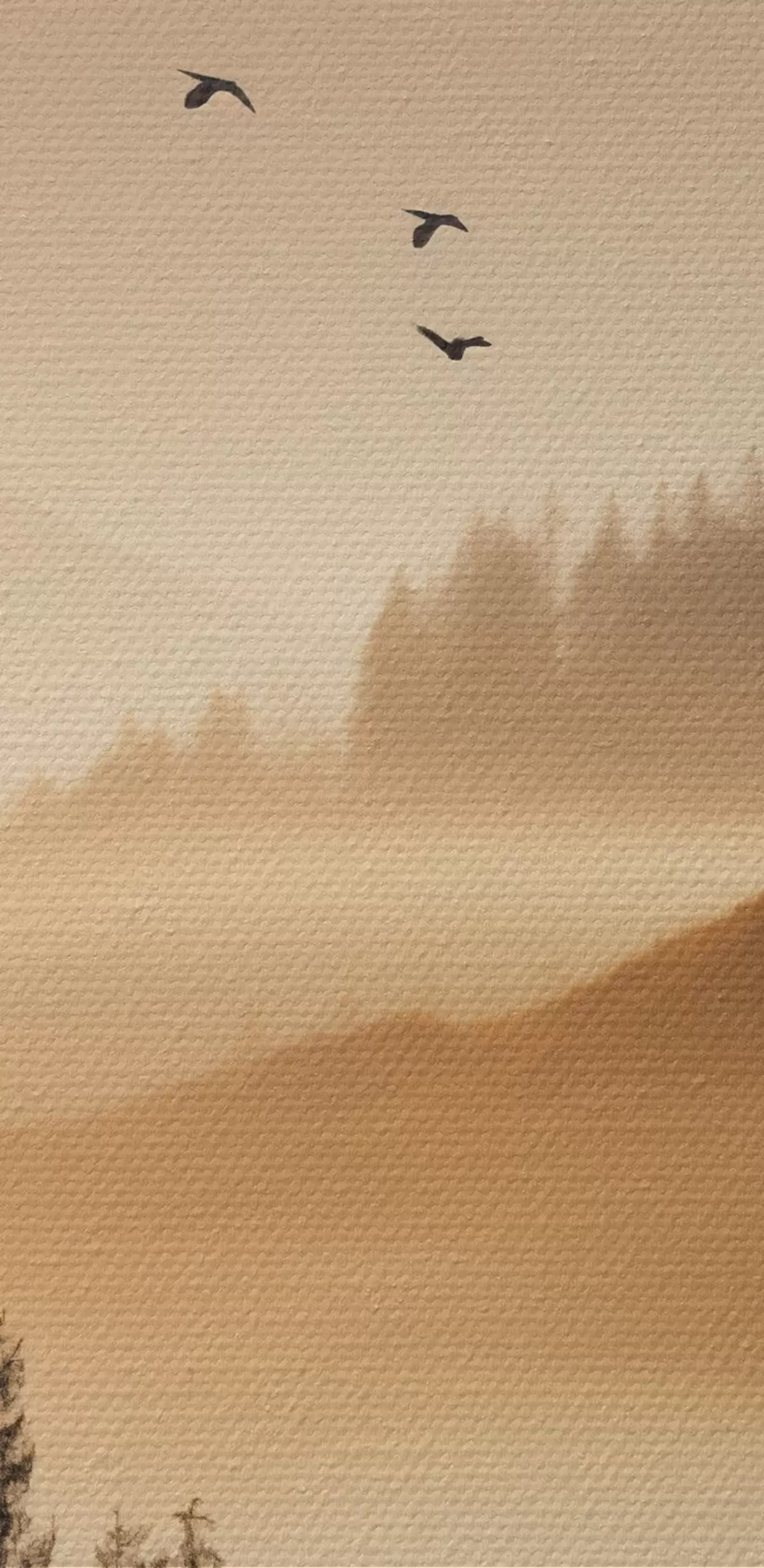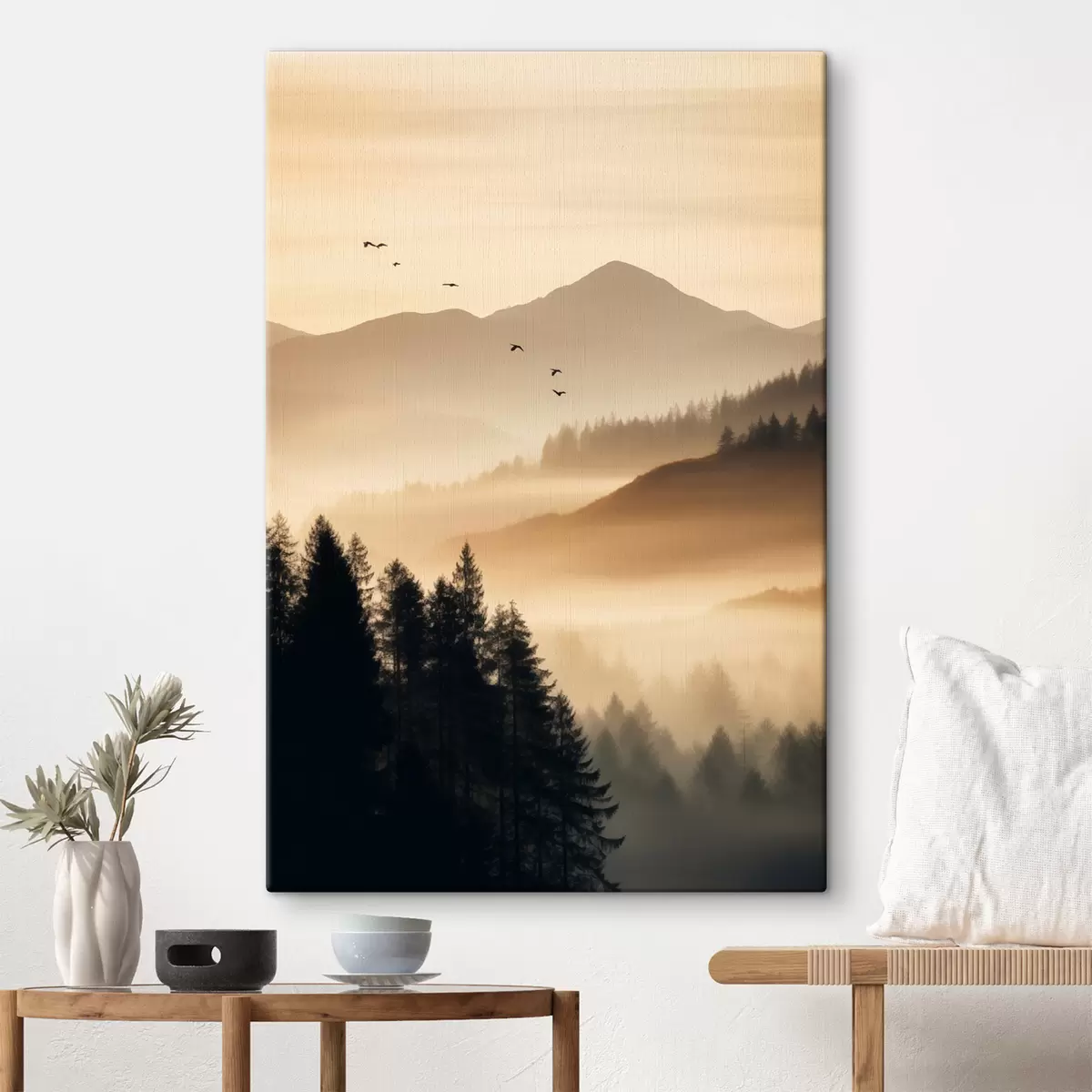 Obraz Krajobraz górski z lasem i ptakami latającymi na niebie, wszystko pokryte grubą warstwą mgły podczas wschodu słońca Nr s45563
