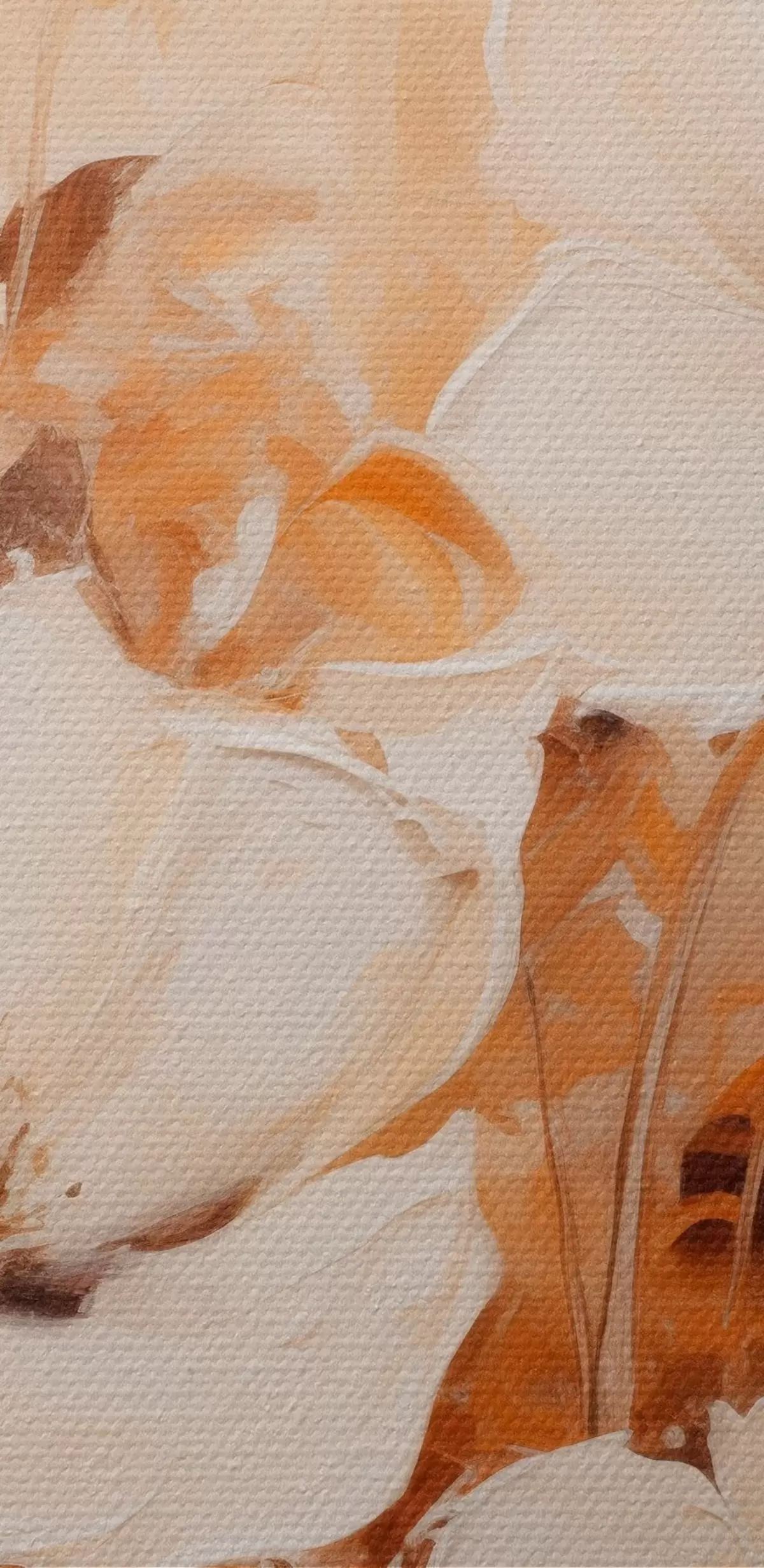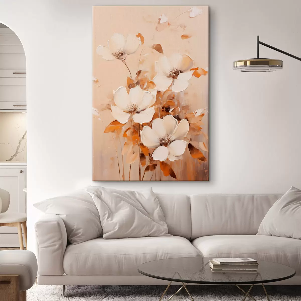 Obraz Białe kwiaty z pomarańczowymi liśćmi, delikatne pociągnięcia pędzla, ciepła paleta kolorów, elegancka kompozycja s45573