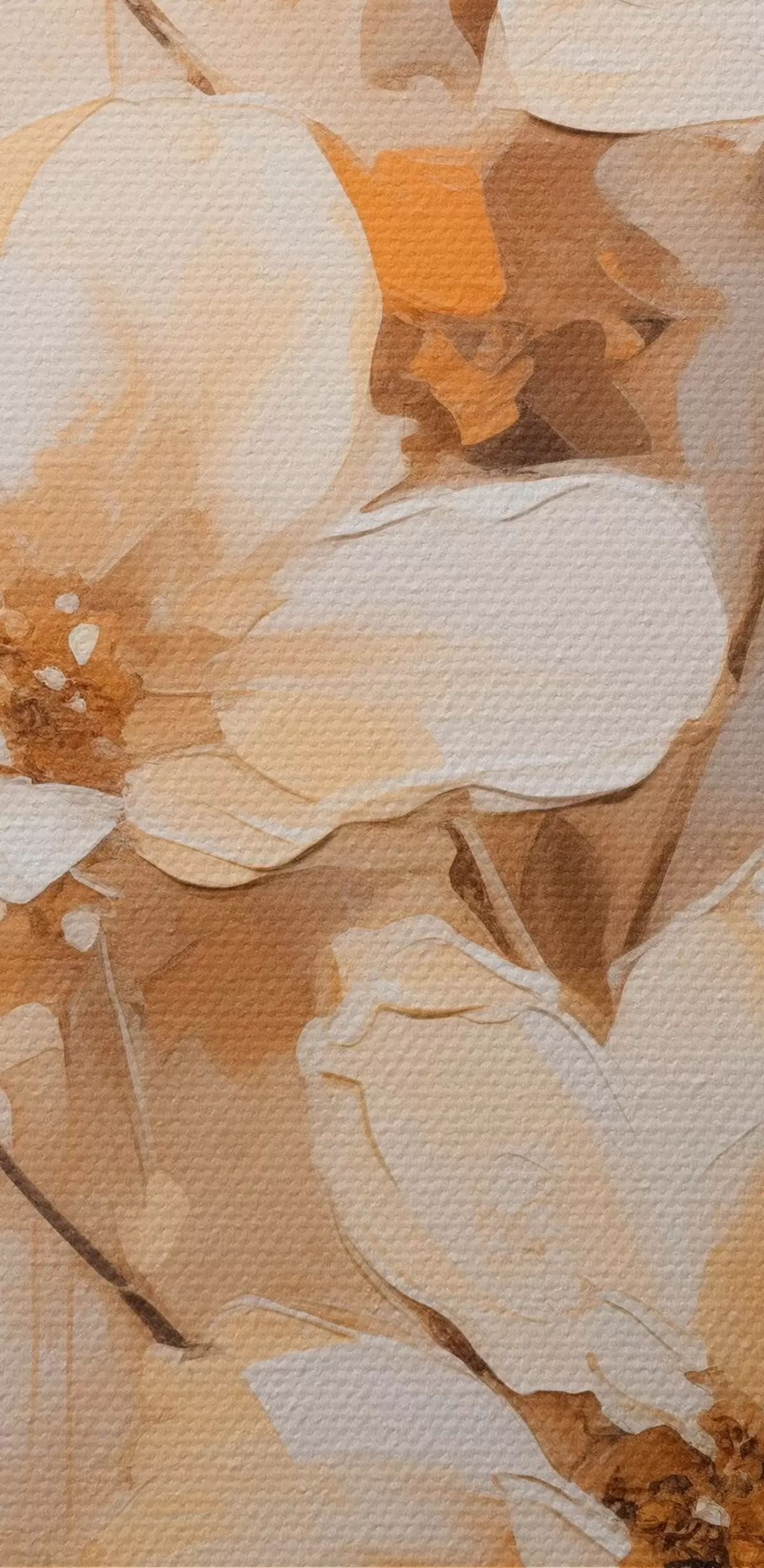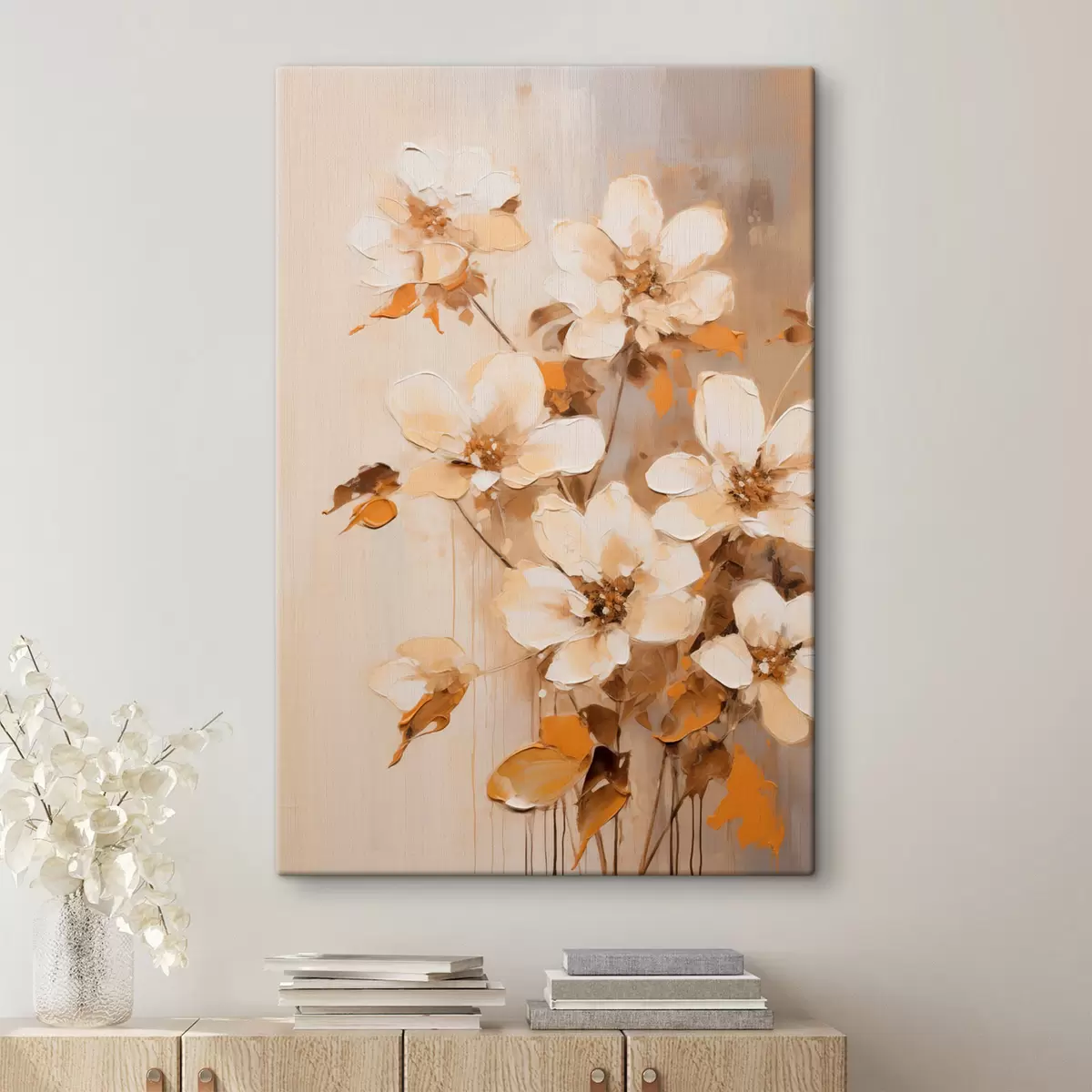 Obraz Białe kwiaty z pomarańczowymi liśćmi, delikatne pociągnięcia pędzla, kompozycja kwiatowa, sztuka botaniczna Nr s45574