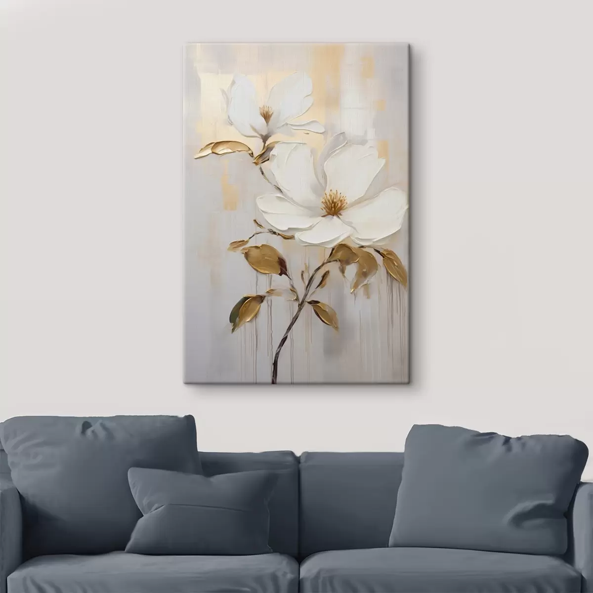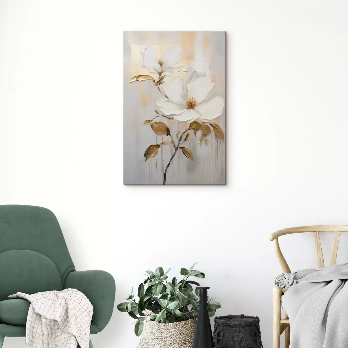 Obraz Dwa białe kwiaty z żółto-pomarańczowymi liśćmi na jasnym tle Nr s45691