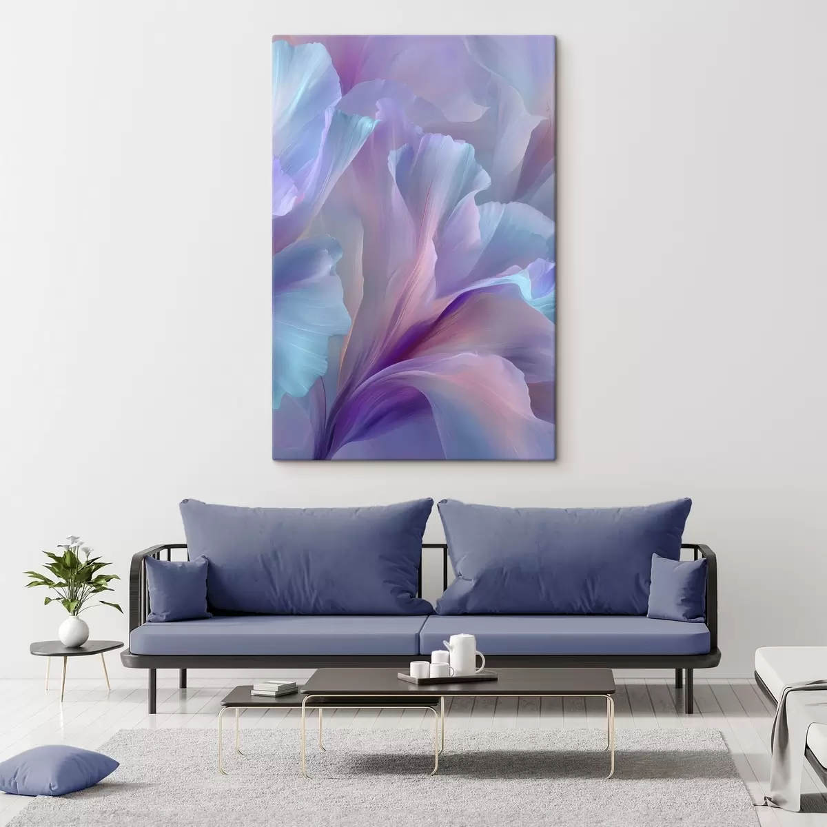 Obraz delikatny, fantazyjny kwiat o płatkach w odcieniach fioletu, błękitu i różu. Nr s45711
