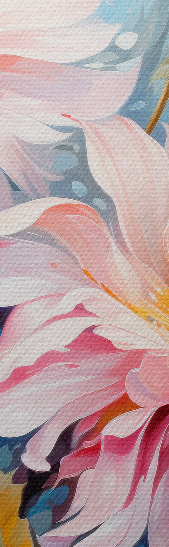 Do zamówienia dostępne są trzy rodzaje materiału: Economic Canvas - gęsty i trwały materiał do druku cyfrowego, identyczny z płótnem malarskim, wodoodporna powierzchnia, realistyczne odwzorowanie szczegółów, materiał średnioziarnisty. Premium Canvas - tekstura przypominająca płótno malarskie (przeplatane drobne nitki). Miękka, szczegółowa reprodukcja obrazu na matowej powierzchni. Eco-Premium - wysokiej jakości tkanina w 100% bawełniana. Dzięki naturalnym włóknom bawełnianym materiał jest trwały i odporny na zużycie. Doskonałe odwzorowanie kolorów i szczegółów.