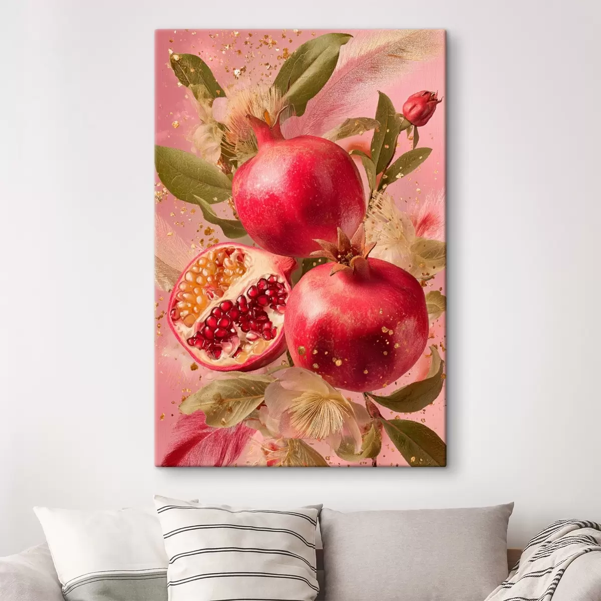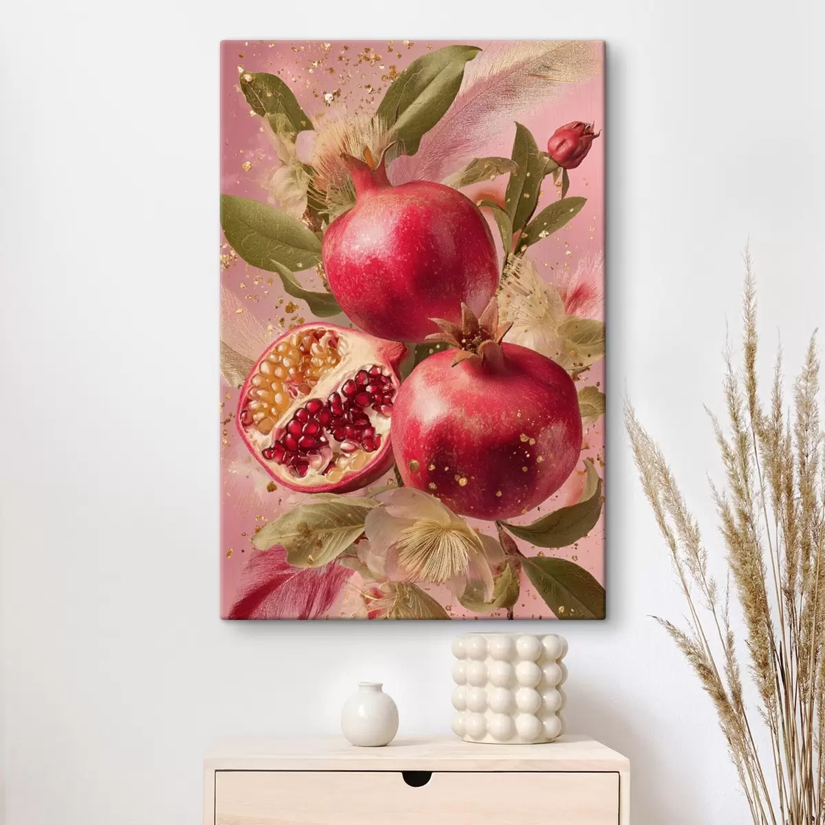 Obraz Dojrzałe granaty na różowym tle z liśćmi i złotymi plamkami Nr s45868