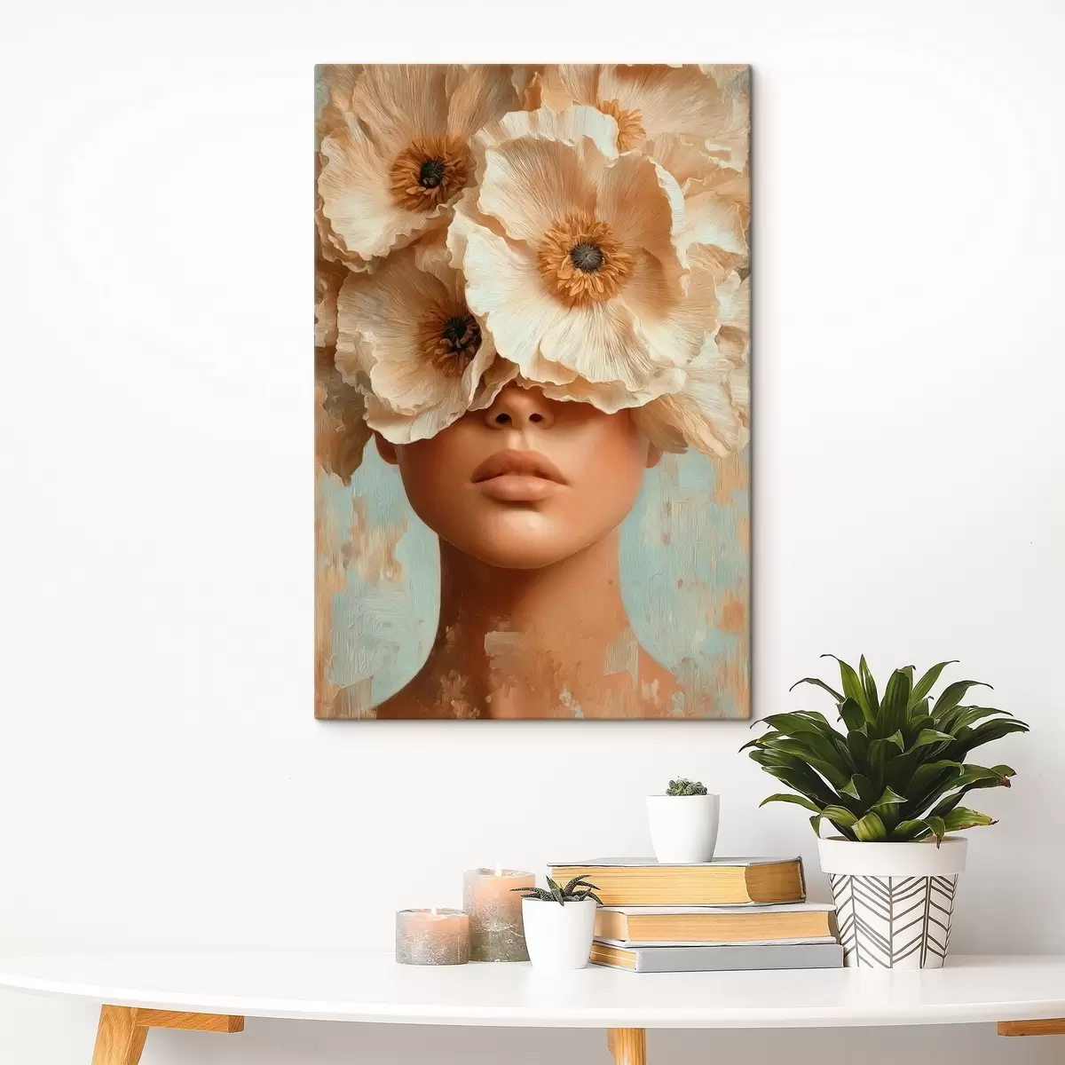 Obraz Portret z beżowymi kwiatami zakrywającymi oczy Nr s45870