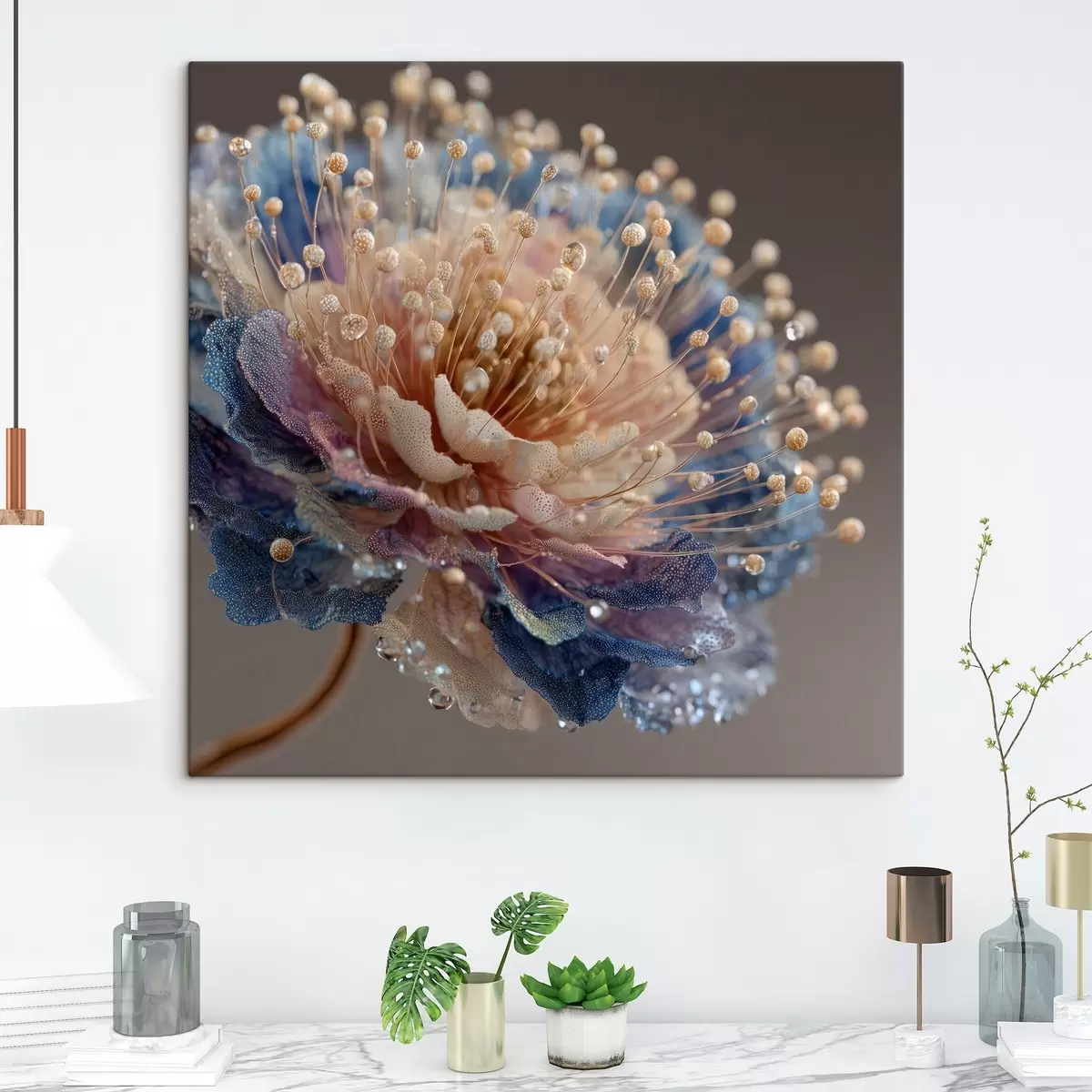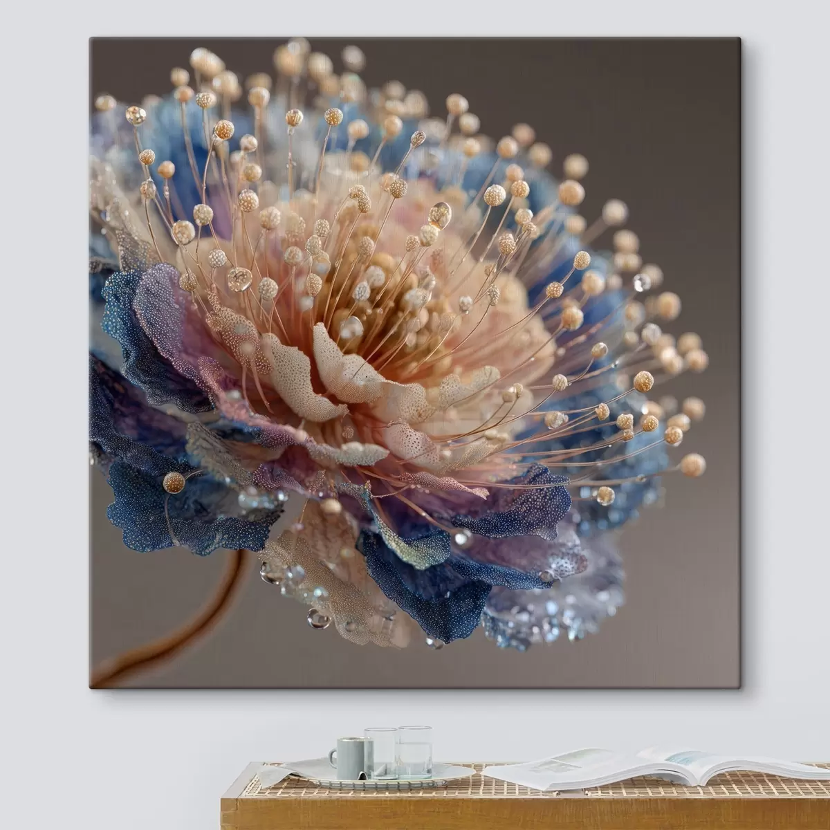 Obraz Perłowy kwiat z kroplami rosy, brzoskwiniowo-niebieskimi płatkami Nr s45911