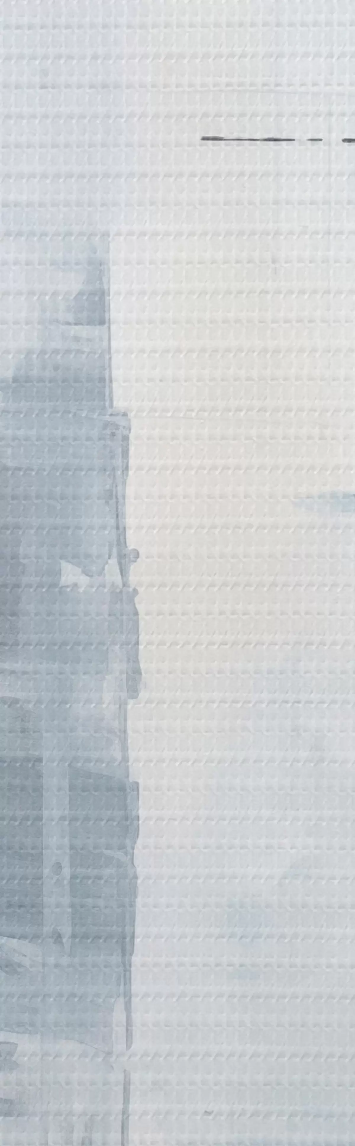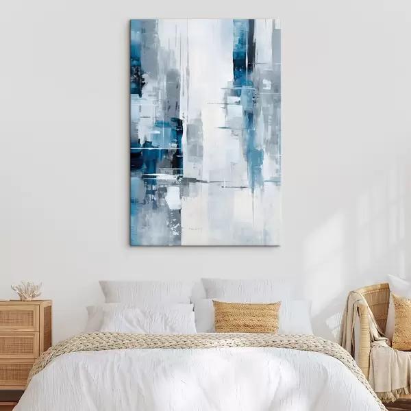 Obraz Imitacja malarstwa abstrakcyjnego w kolorach niebieskim, szarym i białym, z pionowymi liniami i geometrycznymi kształtami Nr s45926