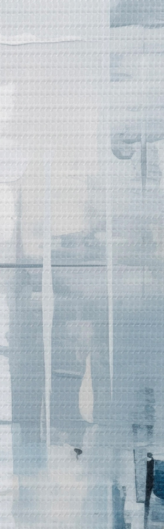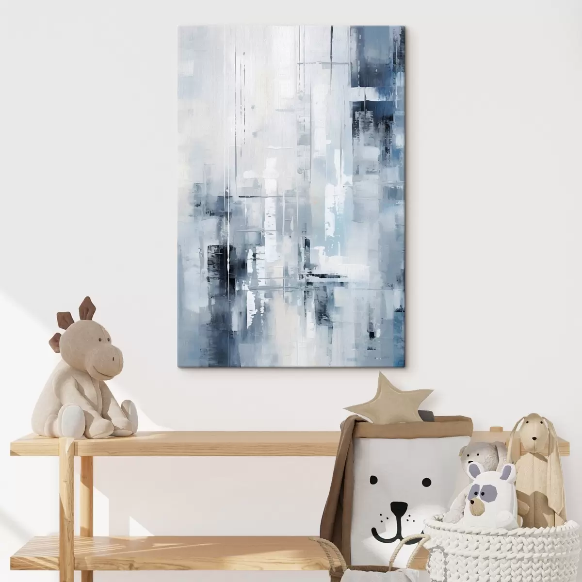 Obraz Imitacja malarstwa abstrakcyjnego w kolorach niebieskim, szarym i białym, z pionowymi liniami i geometrycznymi kształtami Nr s45927