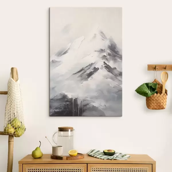 Obraz Ośnieżone szczyty górskie z szarymi cieniami, szare niebo, pociągnięcia pędzla, teksturowane, minimalistyczne Nr s45932