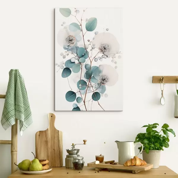 Obraz Abstrakcyjne kwiaty eukaliptusa z białymi płatkami, stonowane zielone liście na gałęziach Nr s45946
