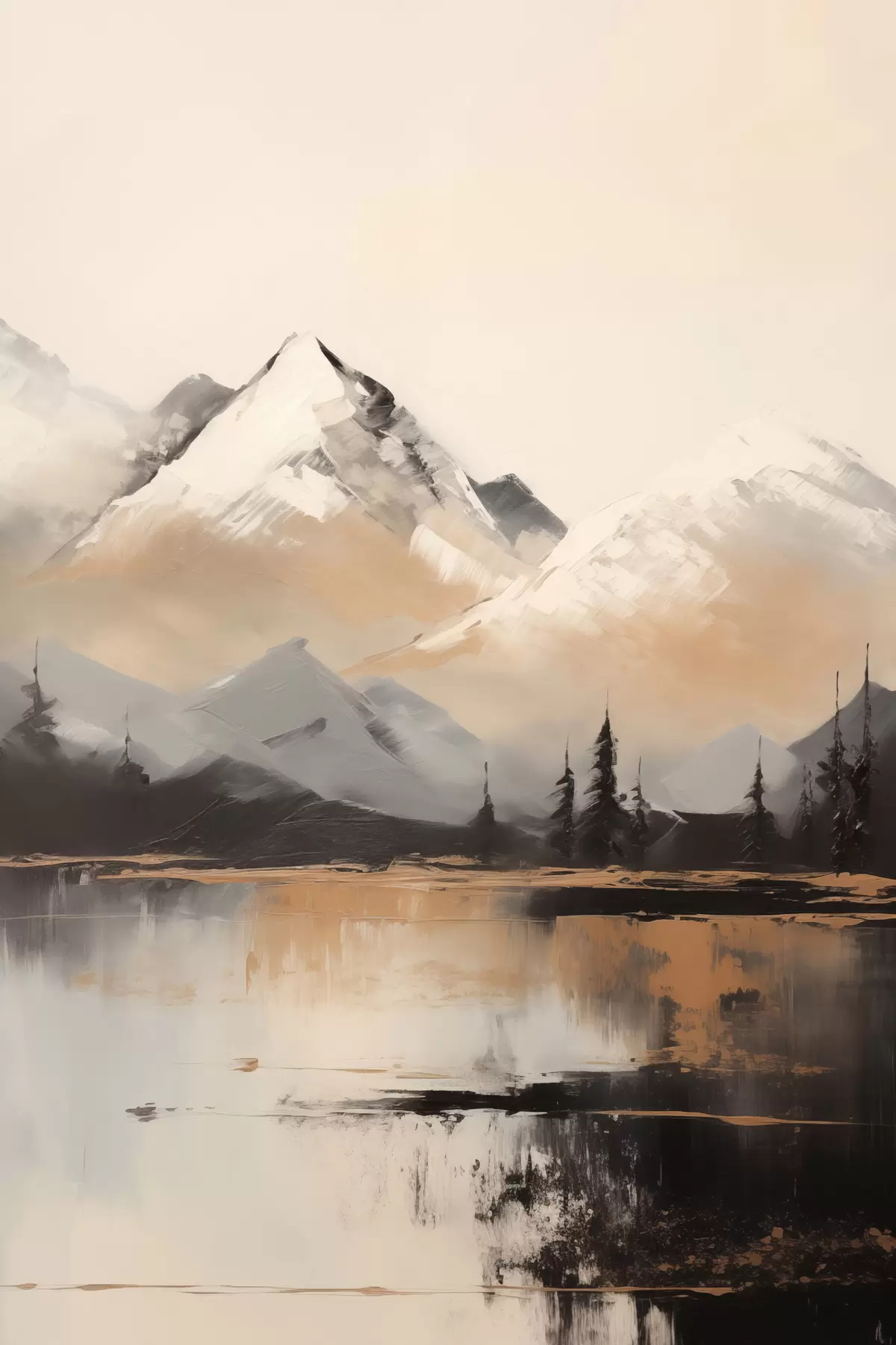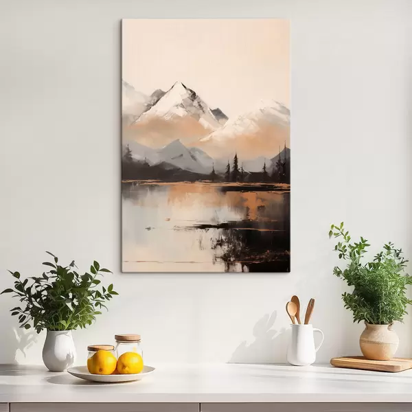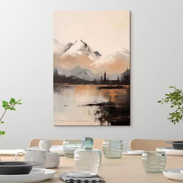 Obraz Ośnieżone góry o fakturze z kilkoma drzewami przed jeziorem Nr s45951