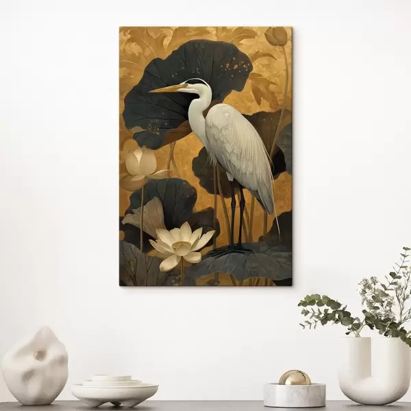 Obraz Czapla wśród lotosów na ciepłym tle Nr s46148