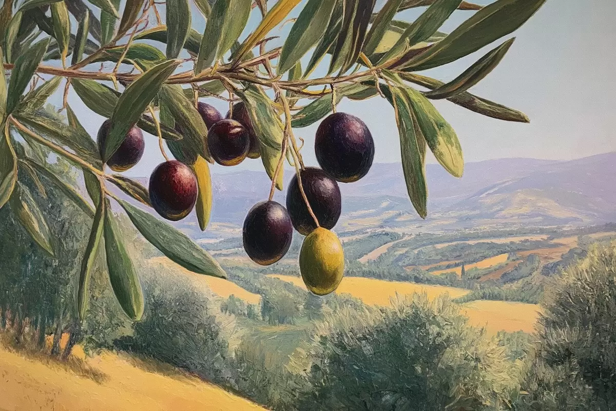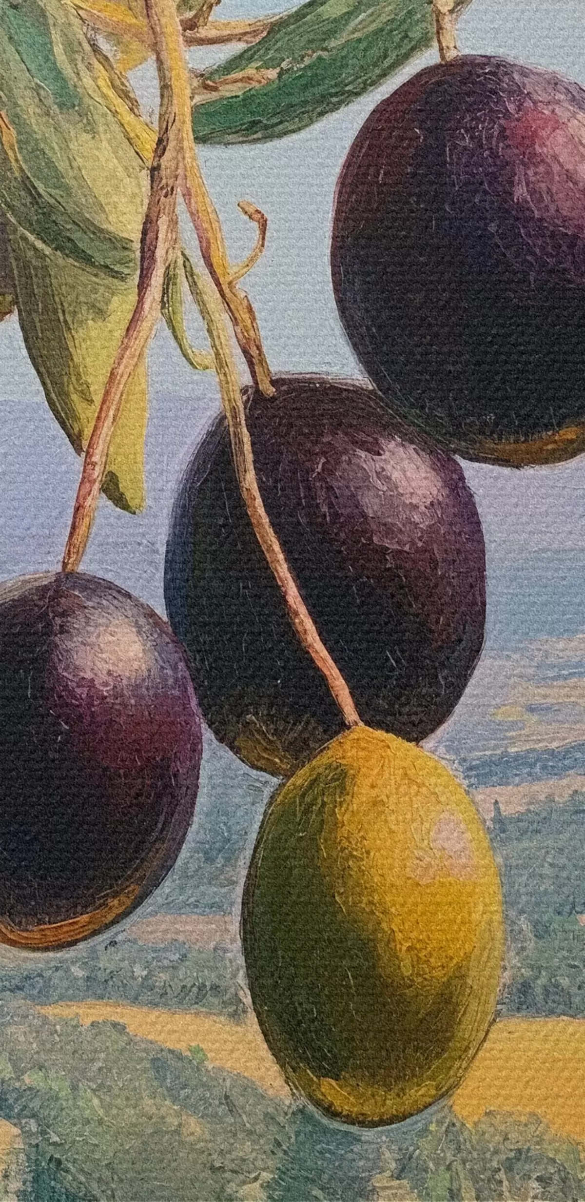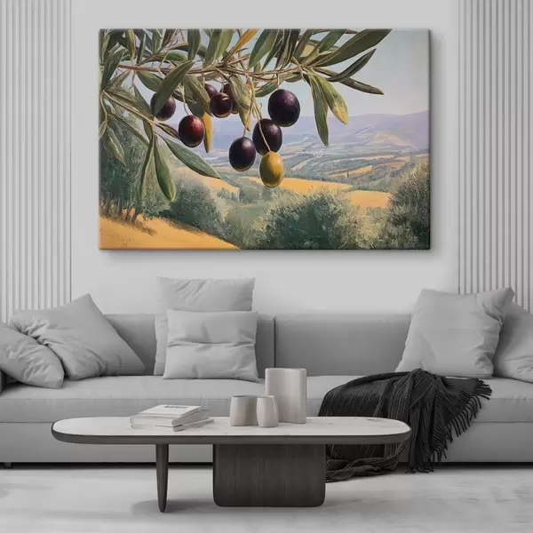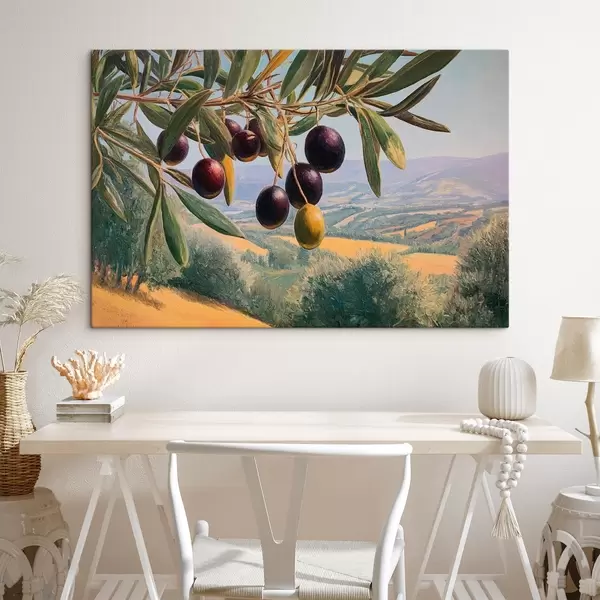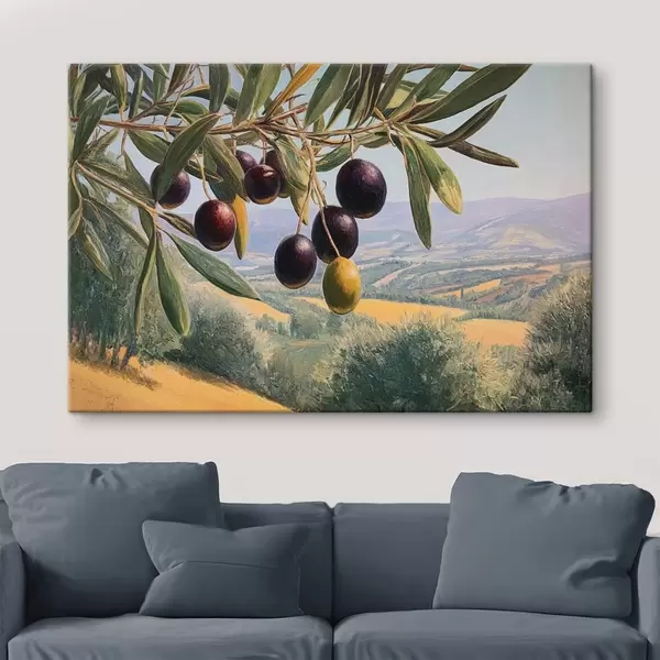 Obraz Gałązka oliwna z ciemnymi owocami na tle letniego krajobrazu Nr s46150