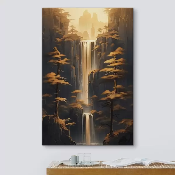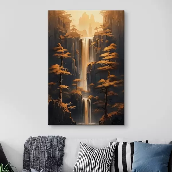 Obraz Wysokie klify z wodospadem i sosnami w wieczornym świetle Nr s46151
