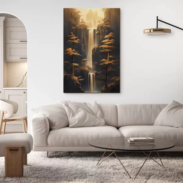 Obraz Wysokie klify z wodospadem i sosnami w wieczornym świetle s46151