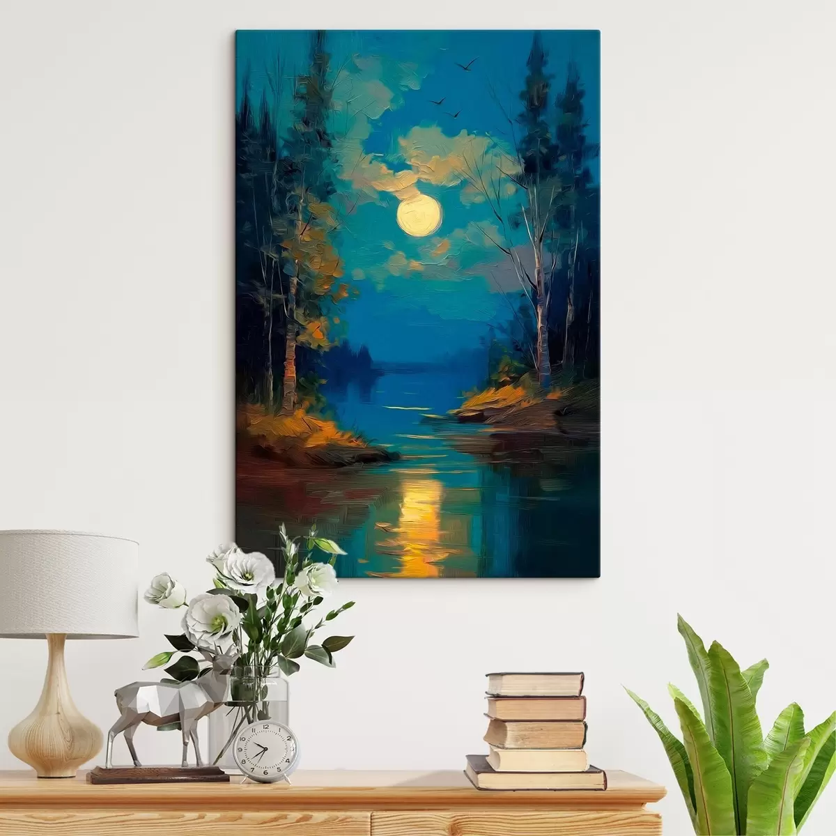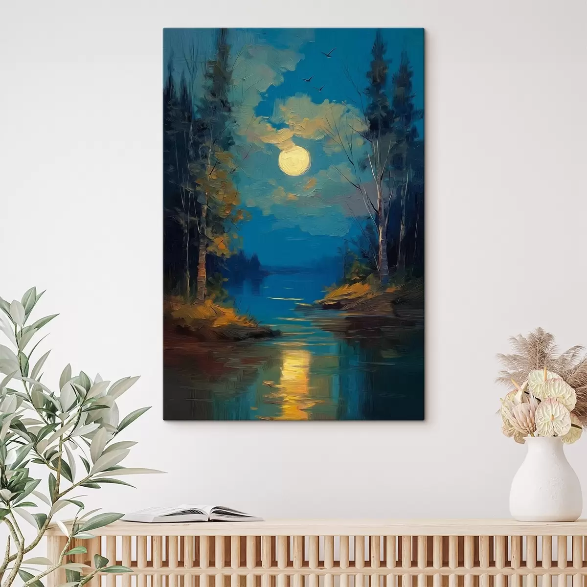 Obraz Światło księżyca nad spokojną rzeką wśród sosen Nr s46164