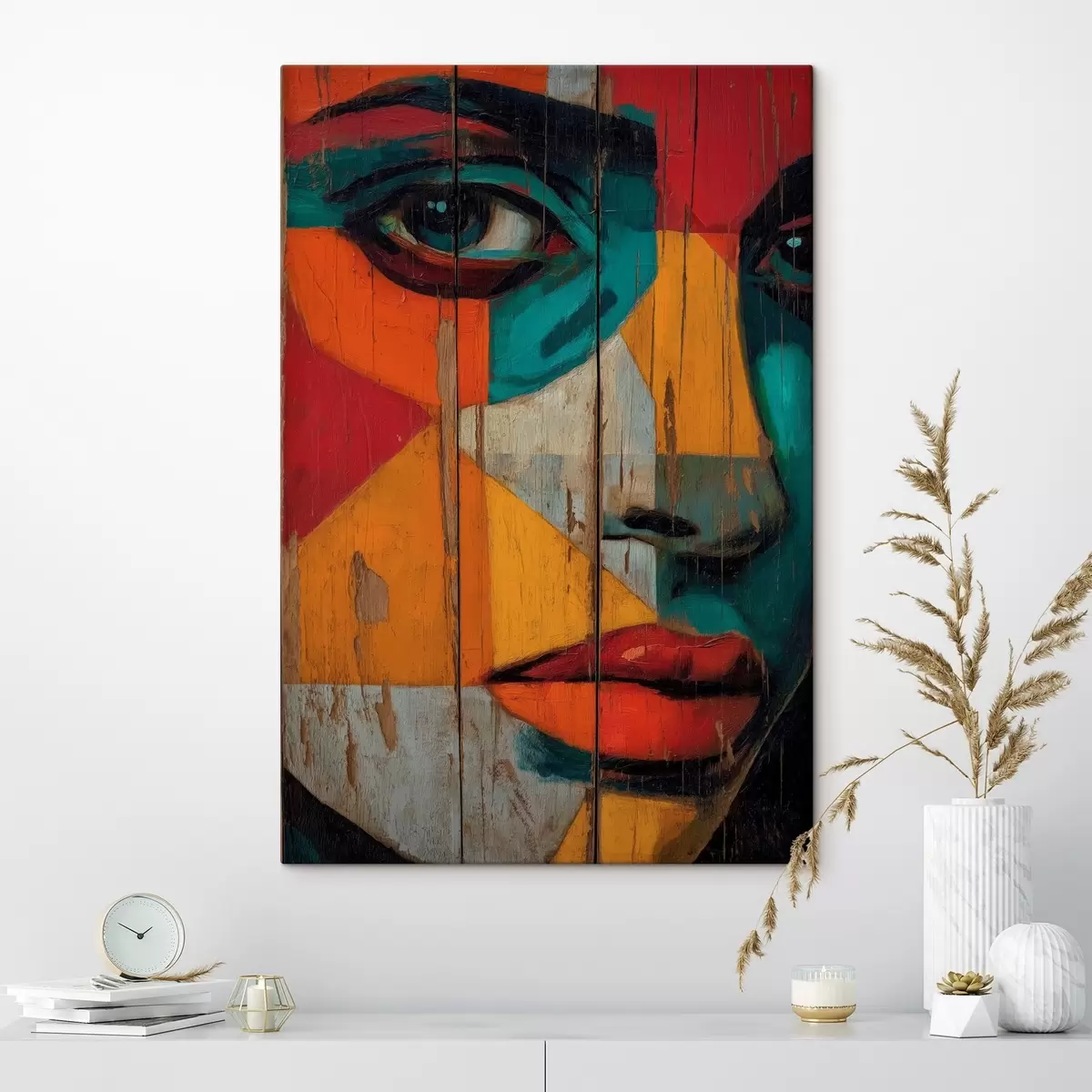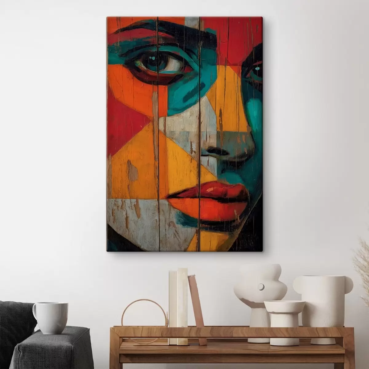 Obraz Jasny geometryczny portret twarzy na drewnianych deskach Nr s46165