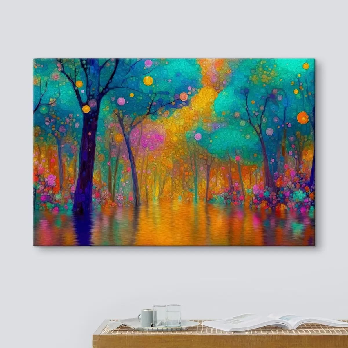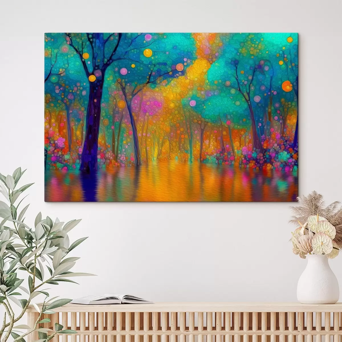 Obraz Żywy, fantastyczny las z odbiciami w wodzie Nr s46171