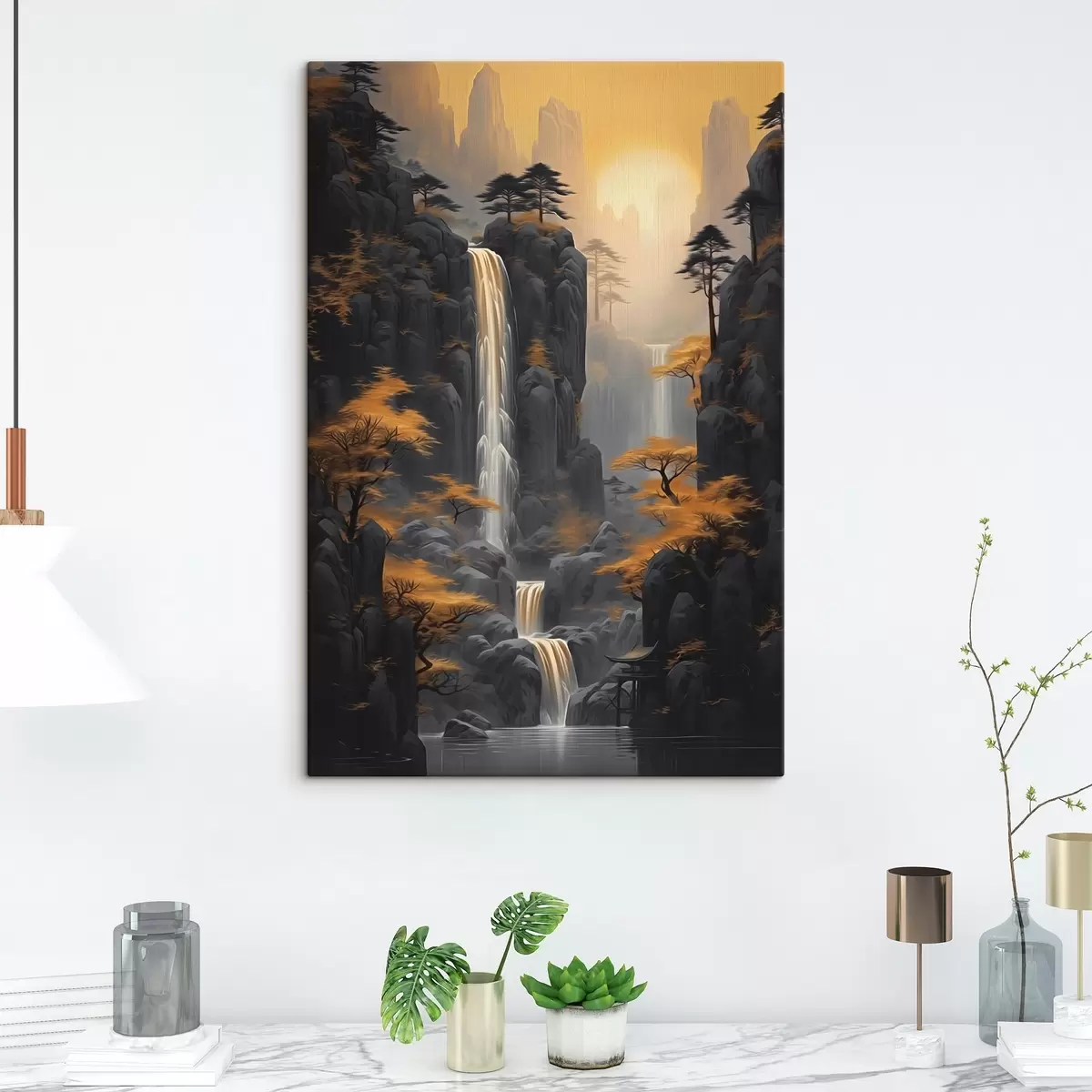 Obraz Skalisty krajobraz z wodospadem w ciepłych barwach zachodu słońca Nr s46177