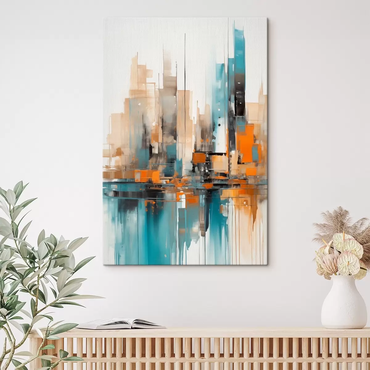 Obraz Abstrakcyjny pejzaż miejski z pomarańczowymi, turkusowymi i brązowymi pionowymi pociągnięciami pędzla i geometrycznymi kształtami s46266