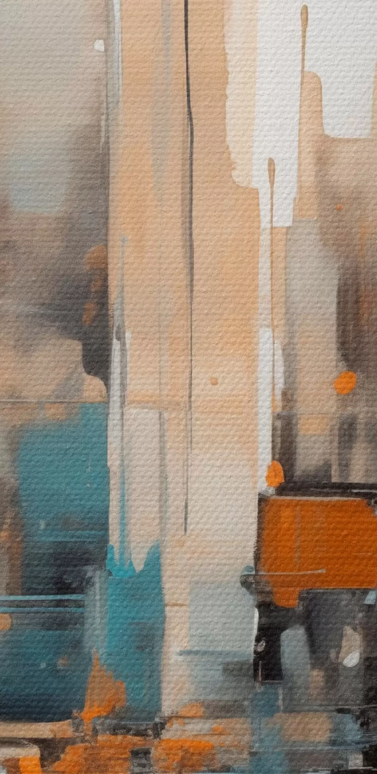 Obraz Abstrakcyjny pejzaż miejski z pomarańczowymi, turkusowymi i brązowymi pionowymi pociągnięciami pędzla i geometrycznymi kształtami Nr s46266