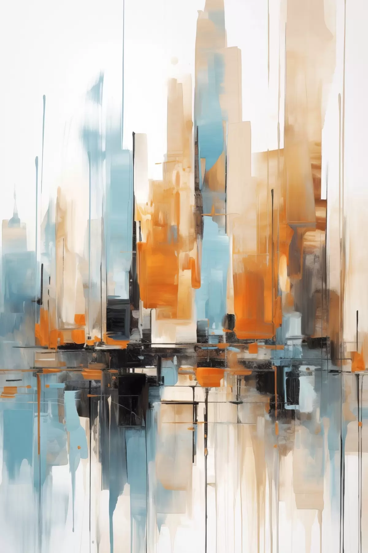 Obraz Abstrakcyjny pejzaż miejski z pionowymi pociągnięciami pędzla w odcieniach pomarańczowego, niebieskiego i białego, styl malarski Nr s46267
