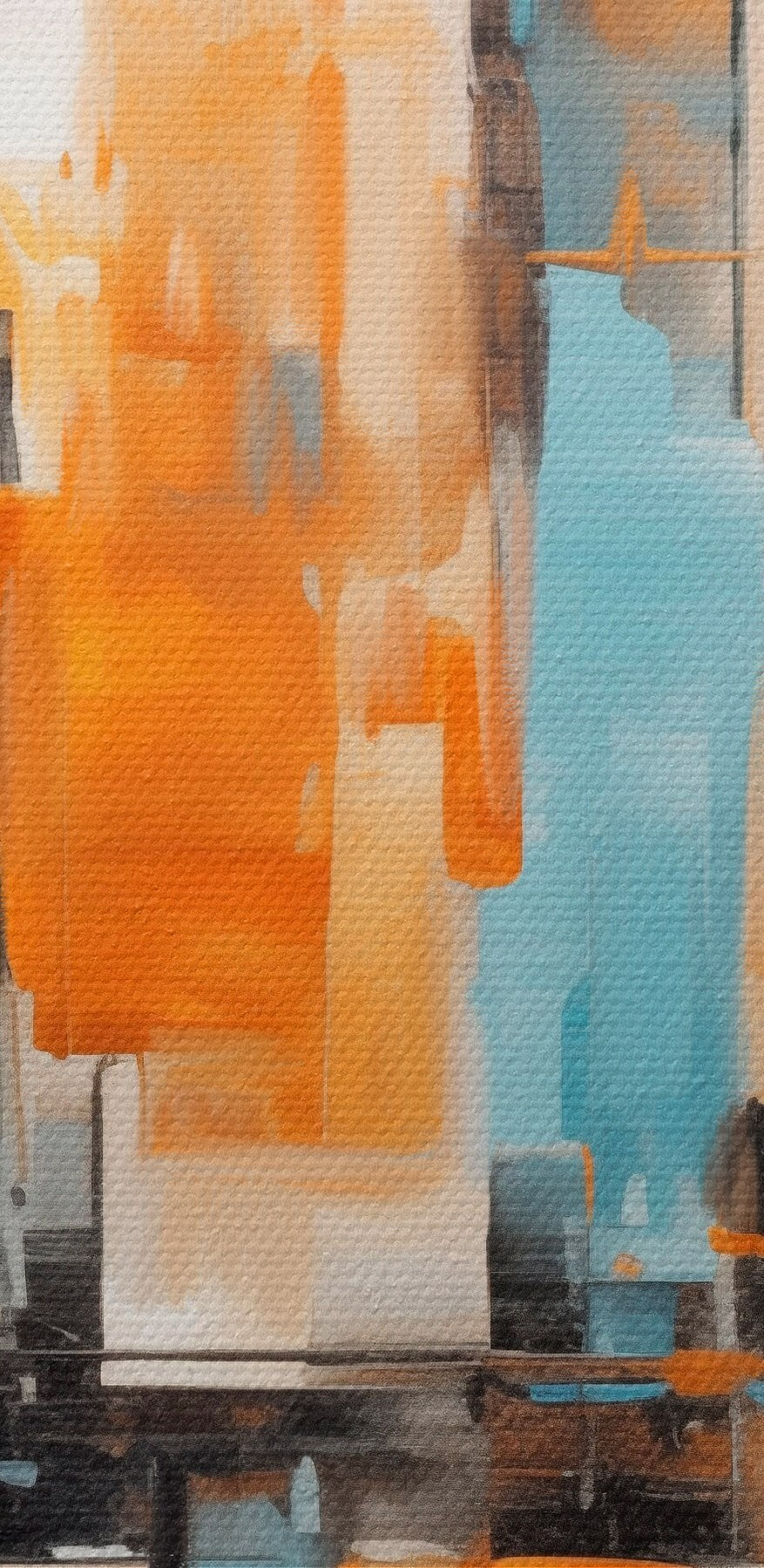 Obraz Abstrakcyjny pejzaż miejski z pionowymi pociągnięciami pędzla w odcieniach pomarańczowego, niebieskiego i białego, styl malarski s46267