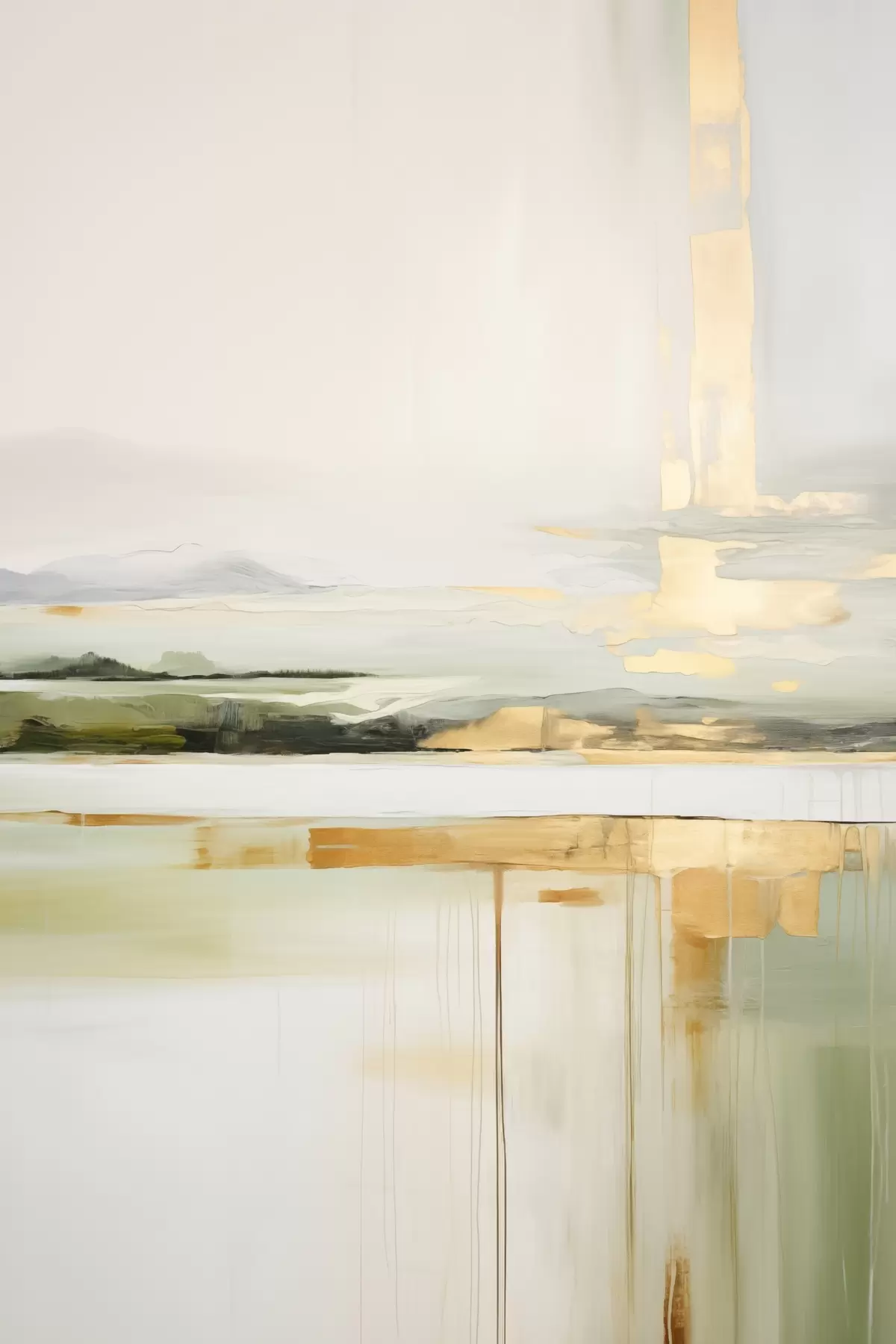 Obraz Abstrakcyjny pejzaż z żółtymi akcentami, minimalistyczna kompozycja ziemi, wody i nieba, w stonowanej kolorystyce s46268