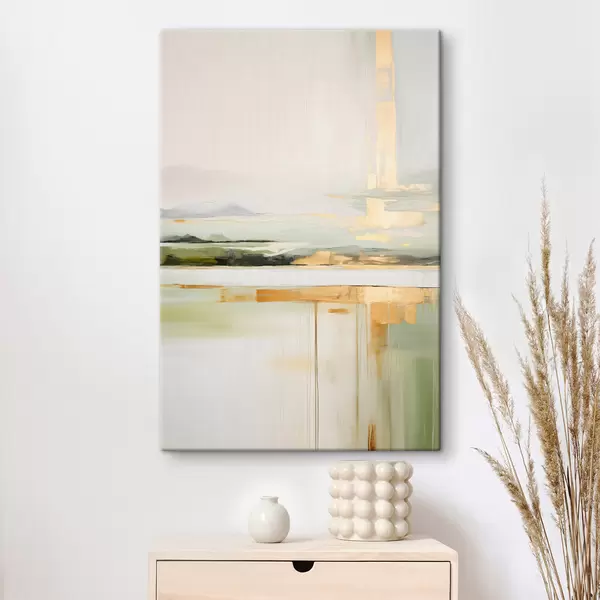 Obraz Abstrakcyjny pejzaż z żółtymi akcentami, minimalistyczna kompozycja ziemi, wody i nieba, w stonowanej kolorystyce Nr s46268