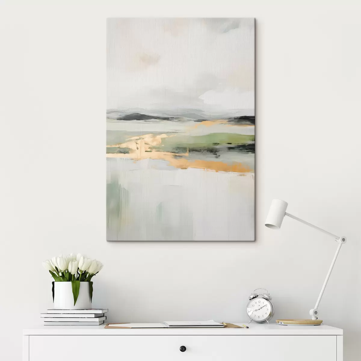 Obraz Abstrakcyjny pejzaż z żółtymi akcentami, minimalistyczna kompozycja ziemi, wody i nieba, w stonowanej kolorystyce s46269