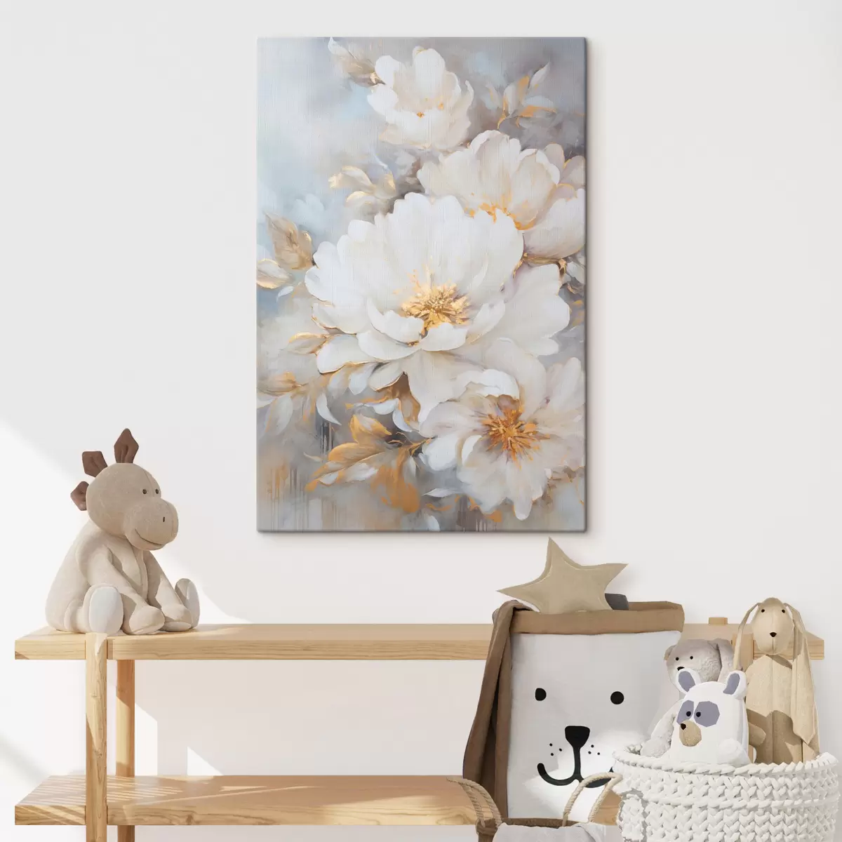 Obraz Białe piwonie z żółtymi środkami i liśćmi, delikatne pociągnięcia pędzla, jasnoniebieskie tło, kompozycja kwiatowa s46271